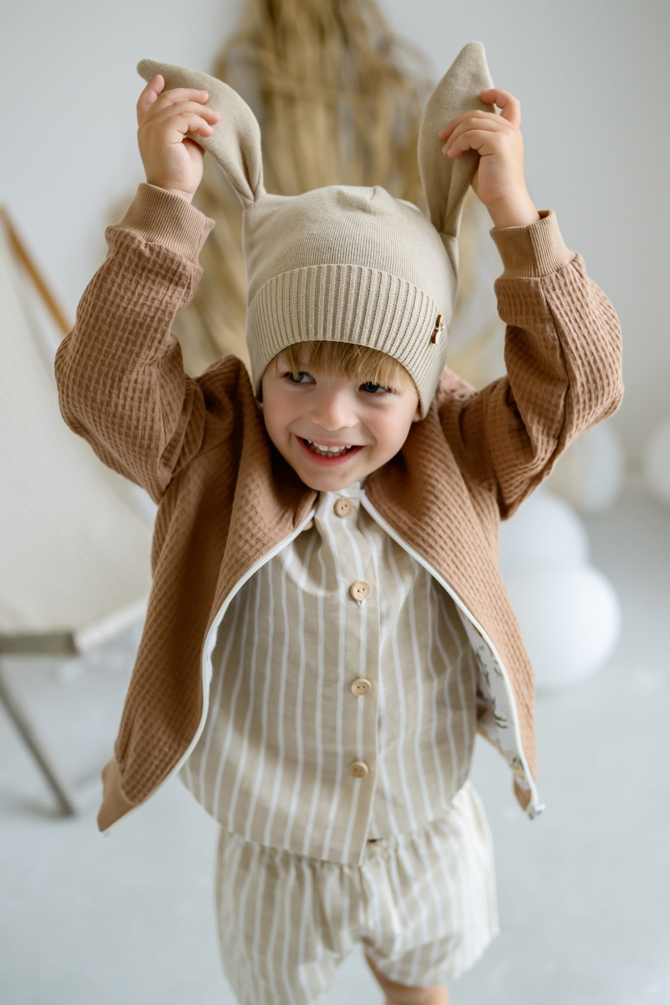 Bawełniana czapka dla dziecka NORI na wiosnę z króliczymi uszami.