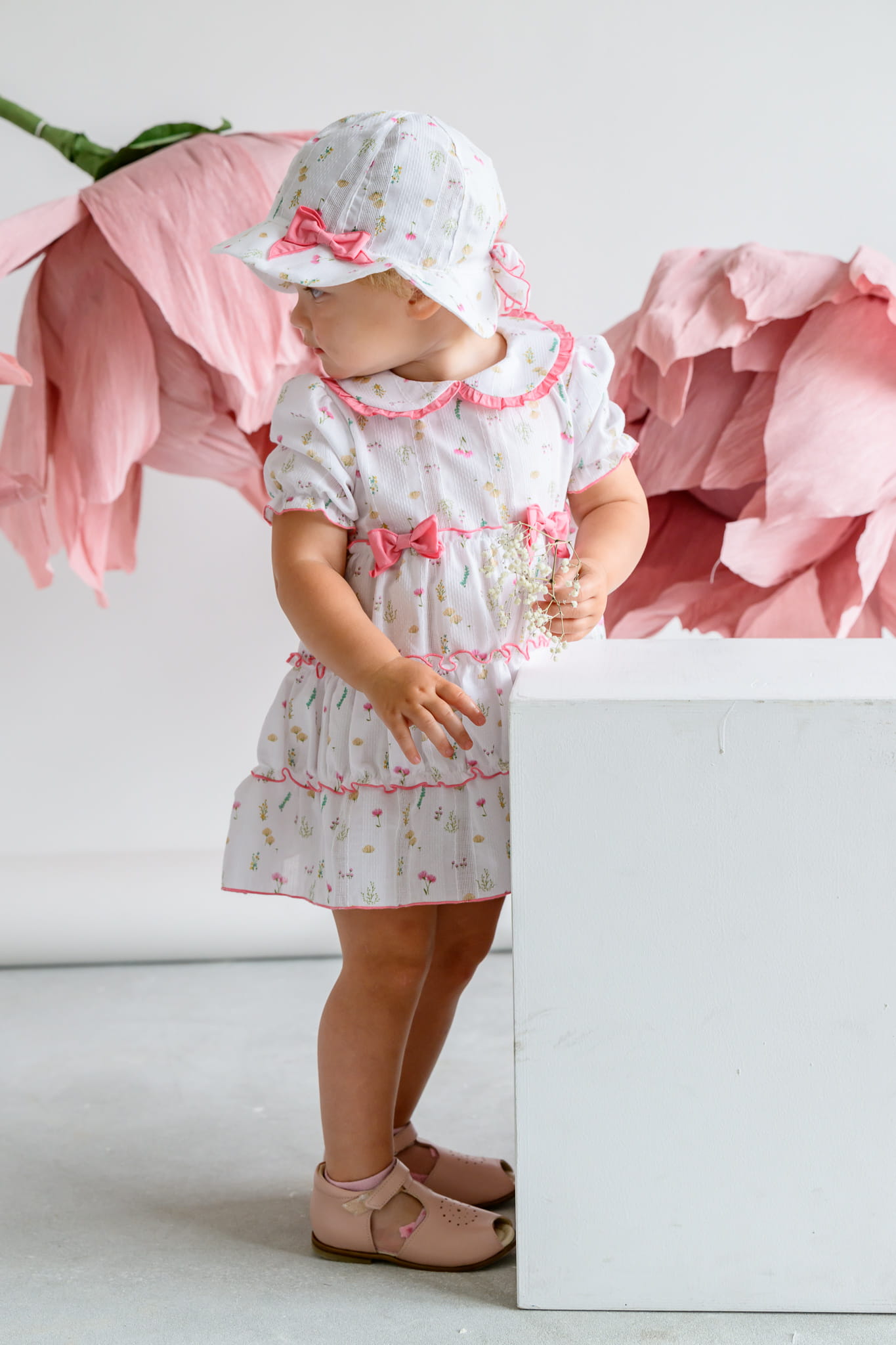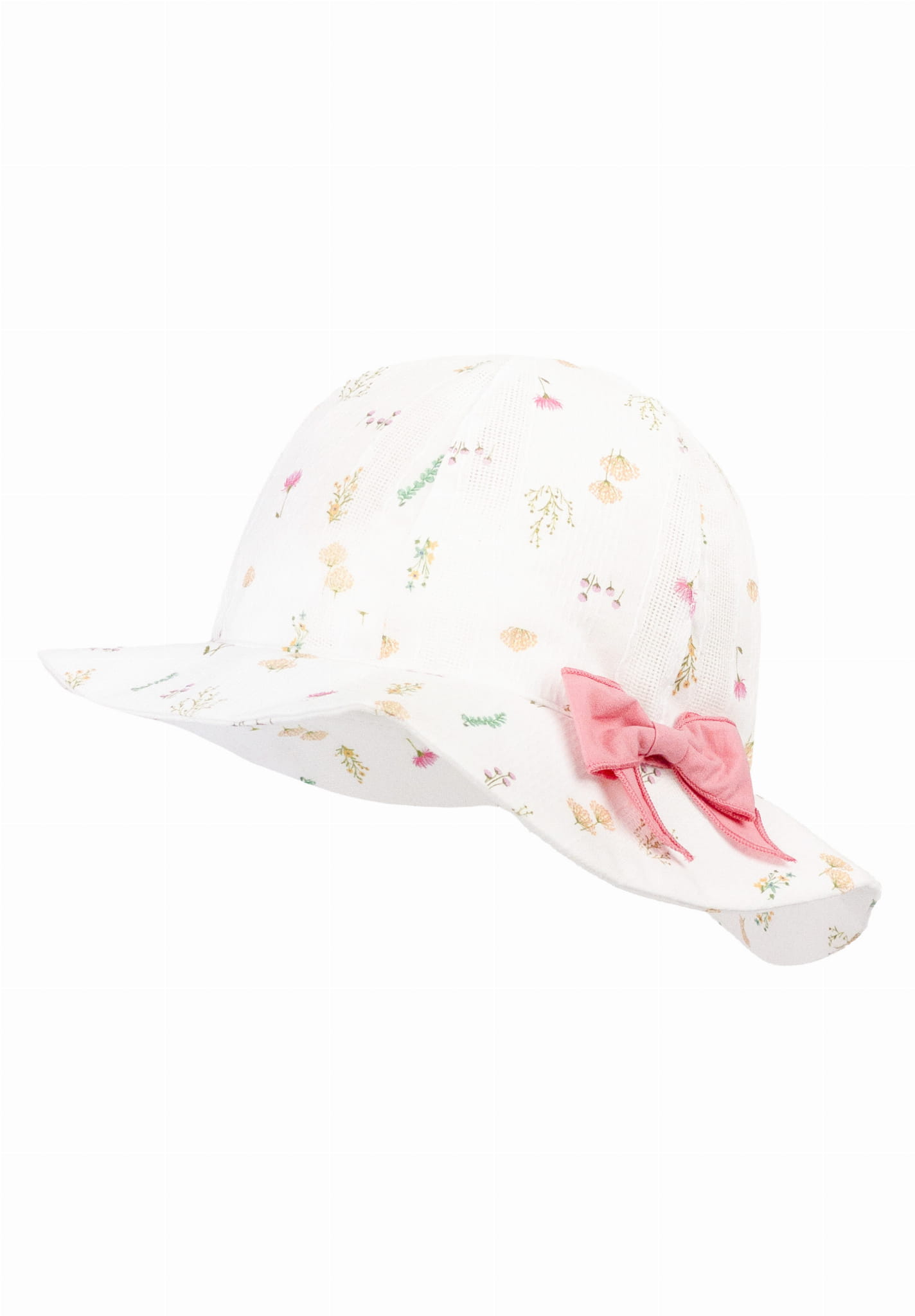 Przewiewny, funkcjonalny i bardzo uroczy kapelusz LUNITA. Wykonany z wysokiej jakości tkaniny bawełnianej, zdobionej nadrukiem malutkich kwiatków.