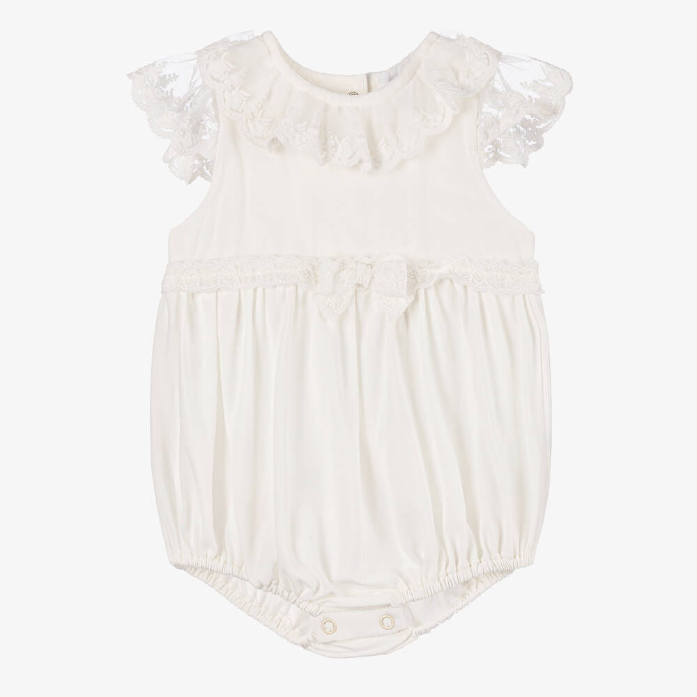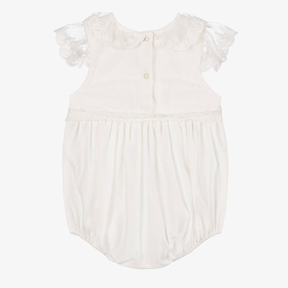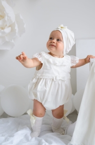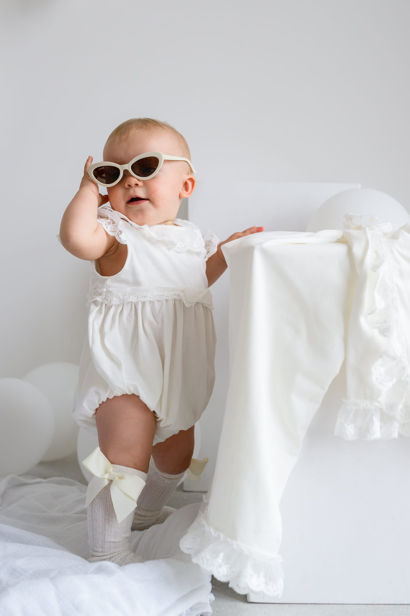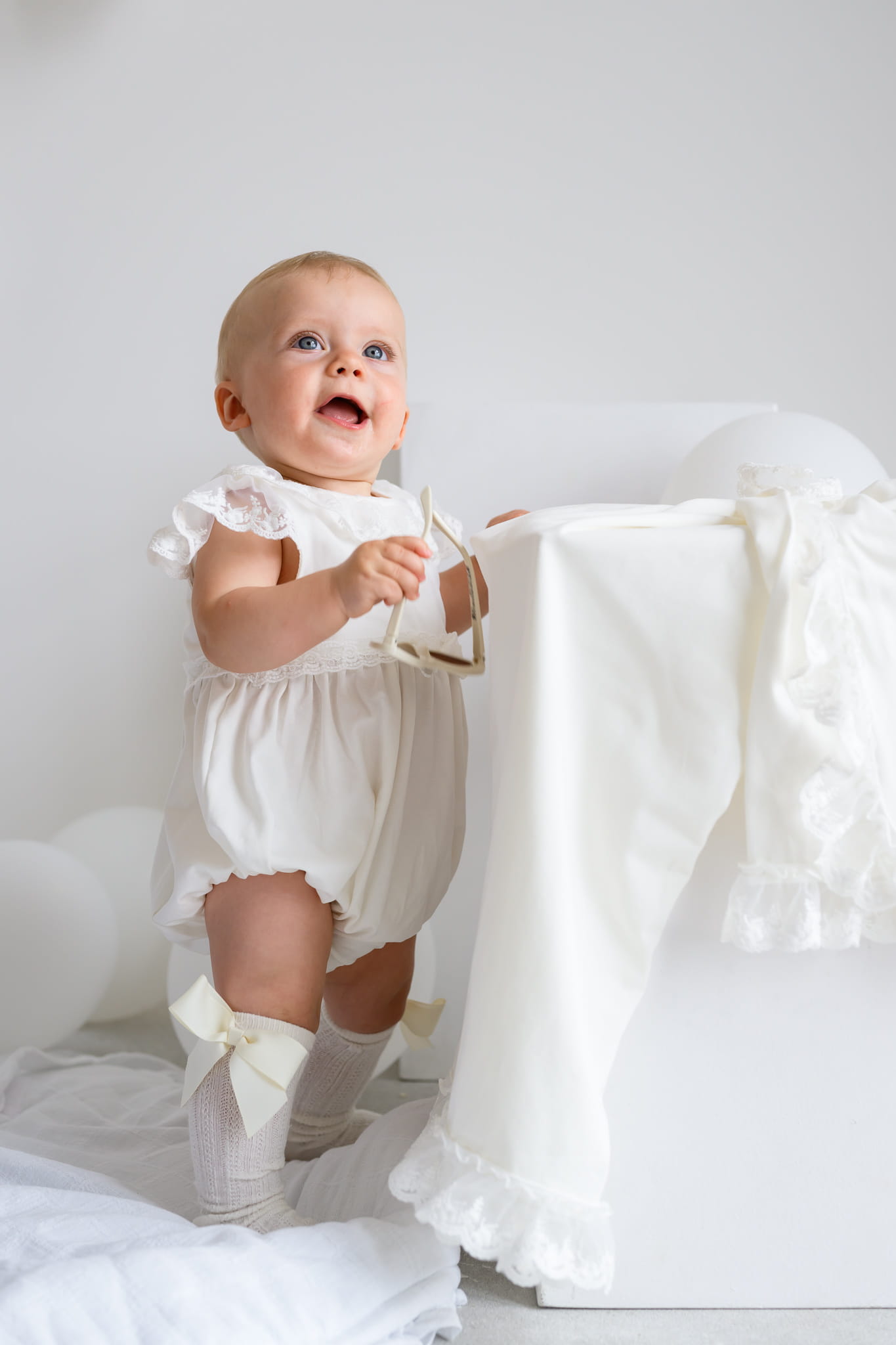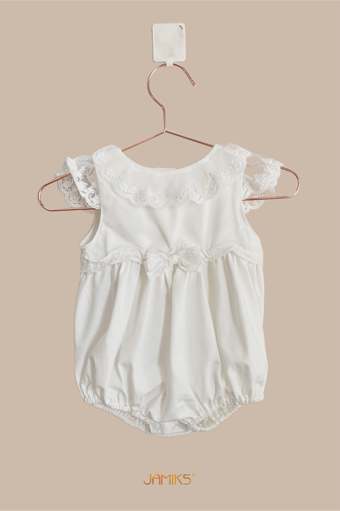 Całość zdobią subtelne koronki i dopracowane detale, które nadają ubranku elegancki, a zarazem dziecięcy charakter. Delikatne zapięcia ułatwiają przebieranie, a luźny krój nie krępuje ruchów dziecka.
