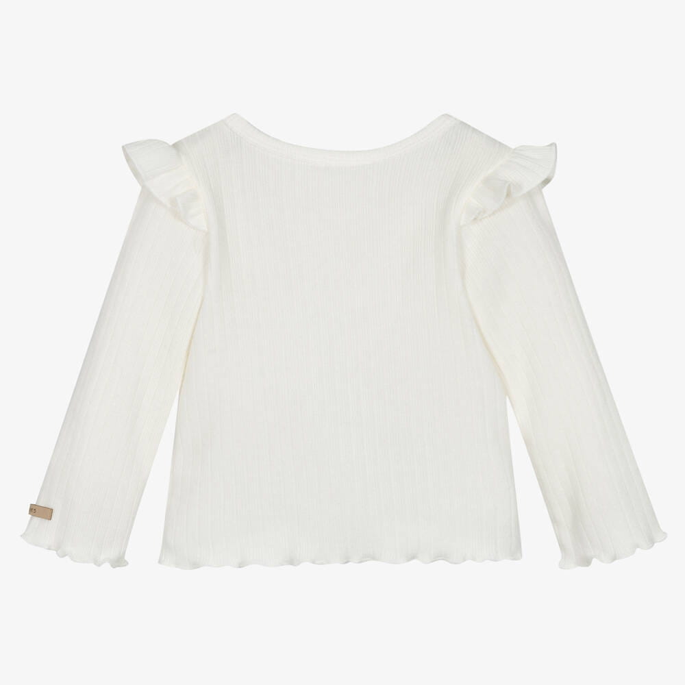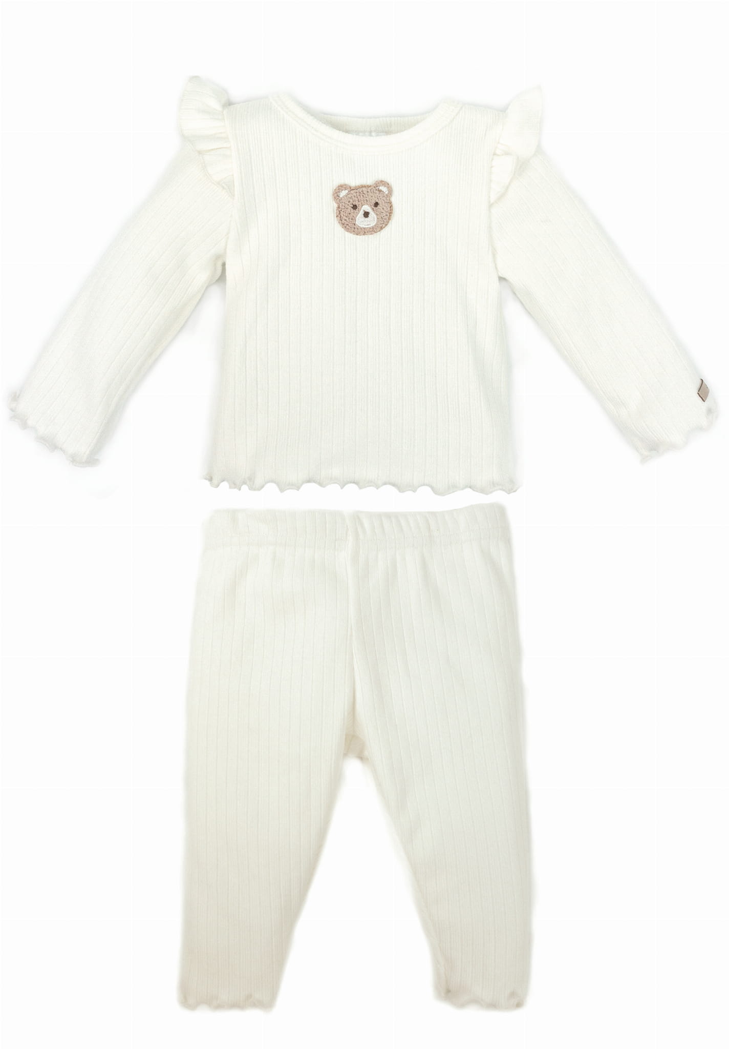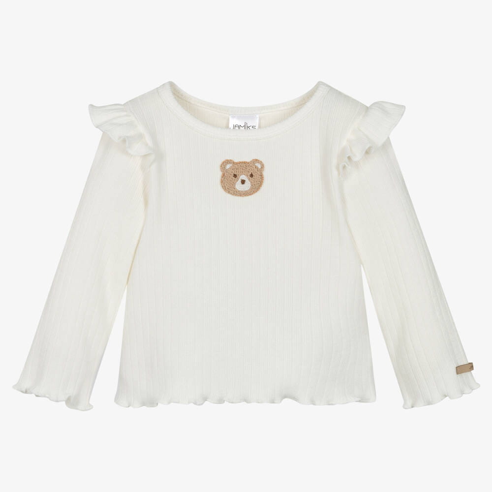 Bluzka posiada uroczą naszywkę misia umieszczoną na środku, co dodaje uroku i radości. Na wysokości barków znajduje się element dekoracyjny w postaci falbanki, nadając bluzce dziewczęcy i uroczy wygląd.