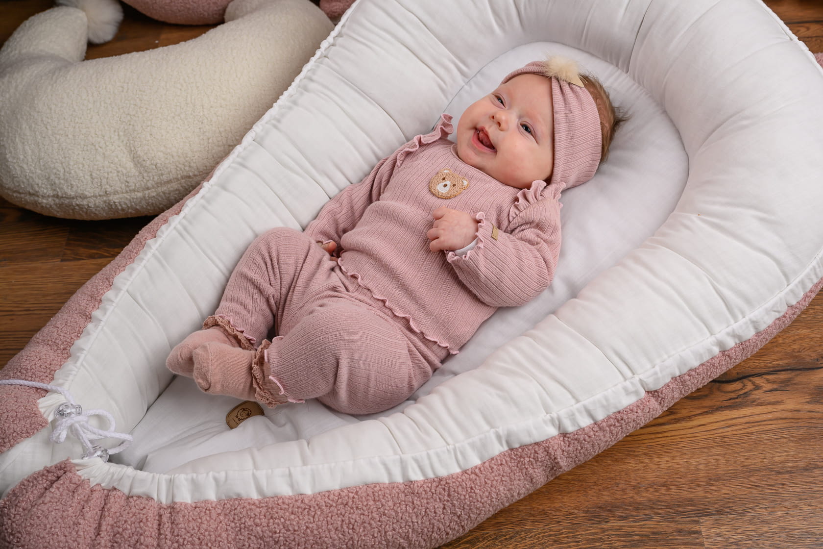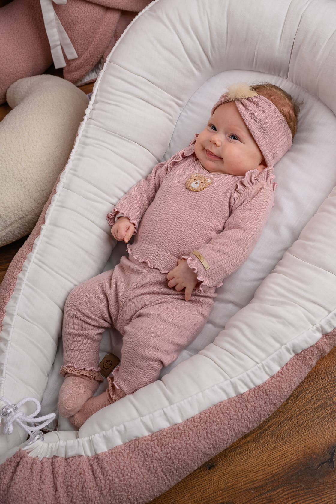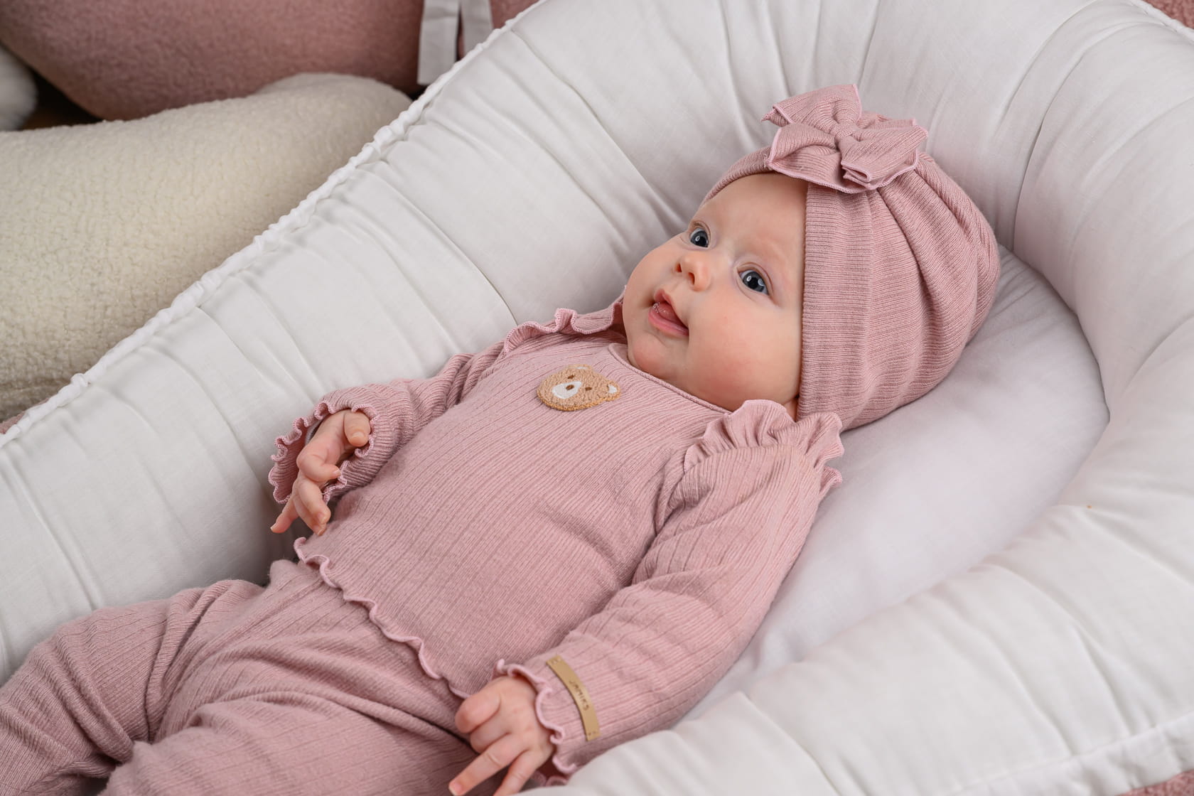 Bluzka posiada uroczą naszywkę misia umieszczoną na środku, co dodaje uroku i radości. Na wysokości barków znajduje się element dekoracyjny w postaci falbanki, nadając bluzce dziewczęcy i uroczy wygląd.