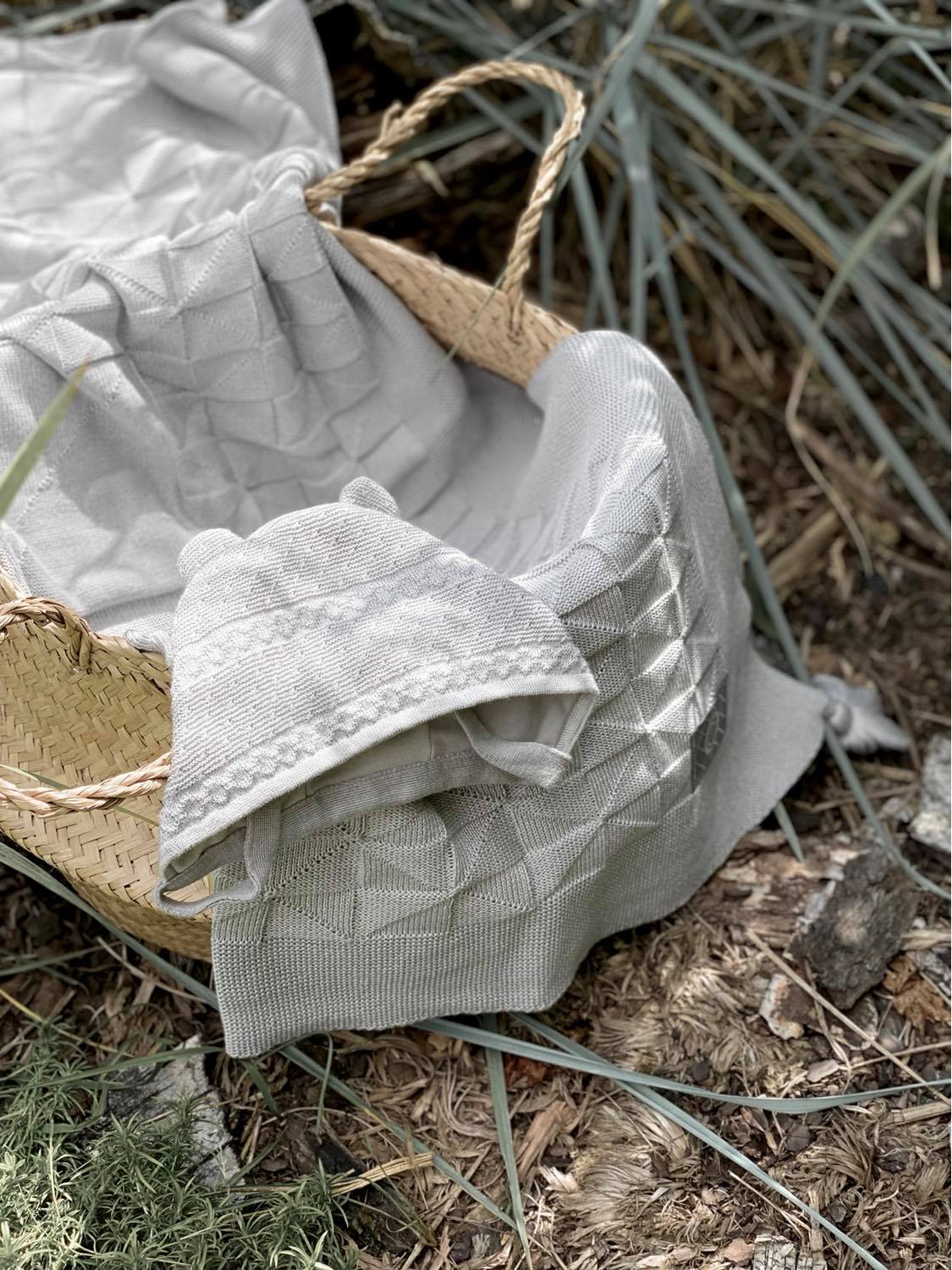 Czapka na wiosnę dla niemowlaka, zdobiona delikatnym splotem i małymi uszkami.