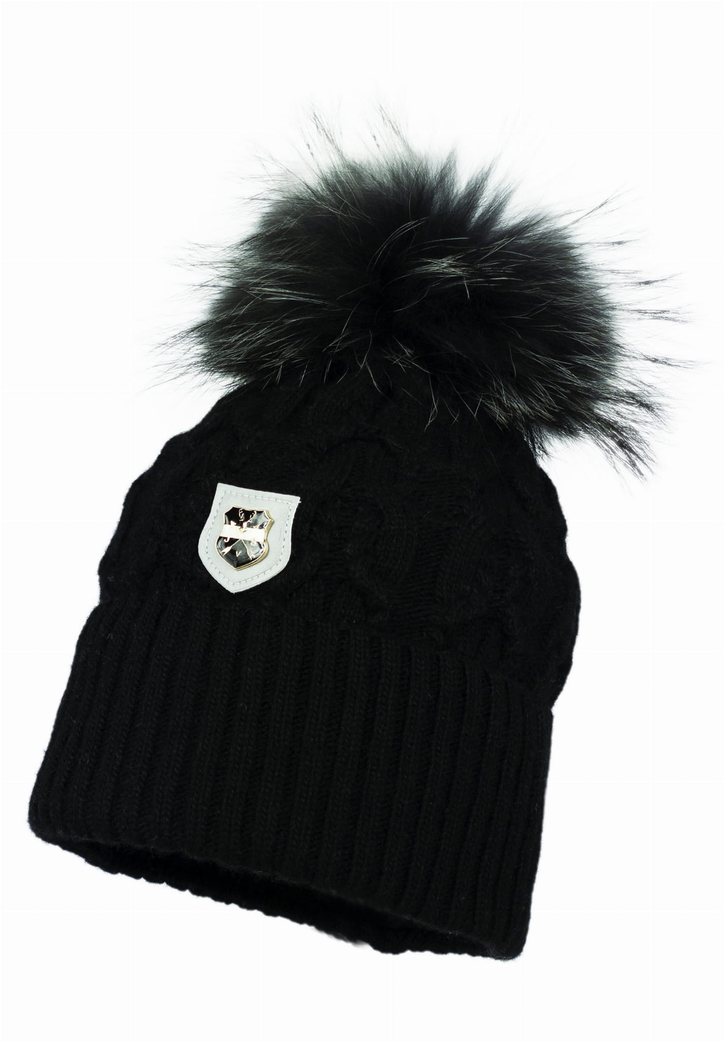 Warto zwrócić uwagę na dekoracyjny splot przędzy oraz ciekawą naszywkę. Zdobienie czapki dopełnia pełny naturalny pompon.