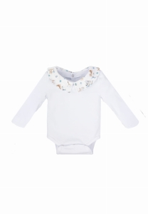 Subtelne body z ozdobnym kołnierzykiem w autorskim princie dla najmłodszych chłopców. Bawełniany materiał z którego zostały wykonane zapewni pełen komfort noszenia maluszkom.