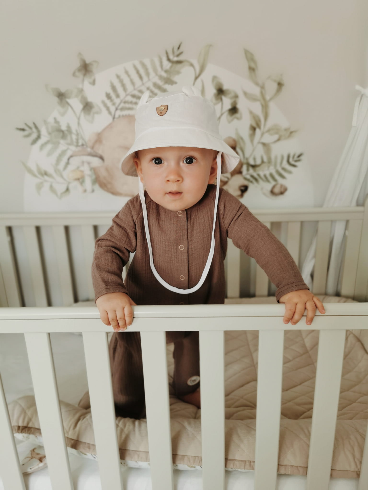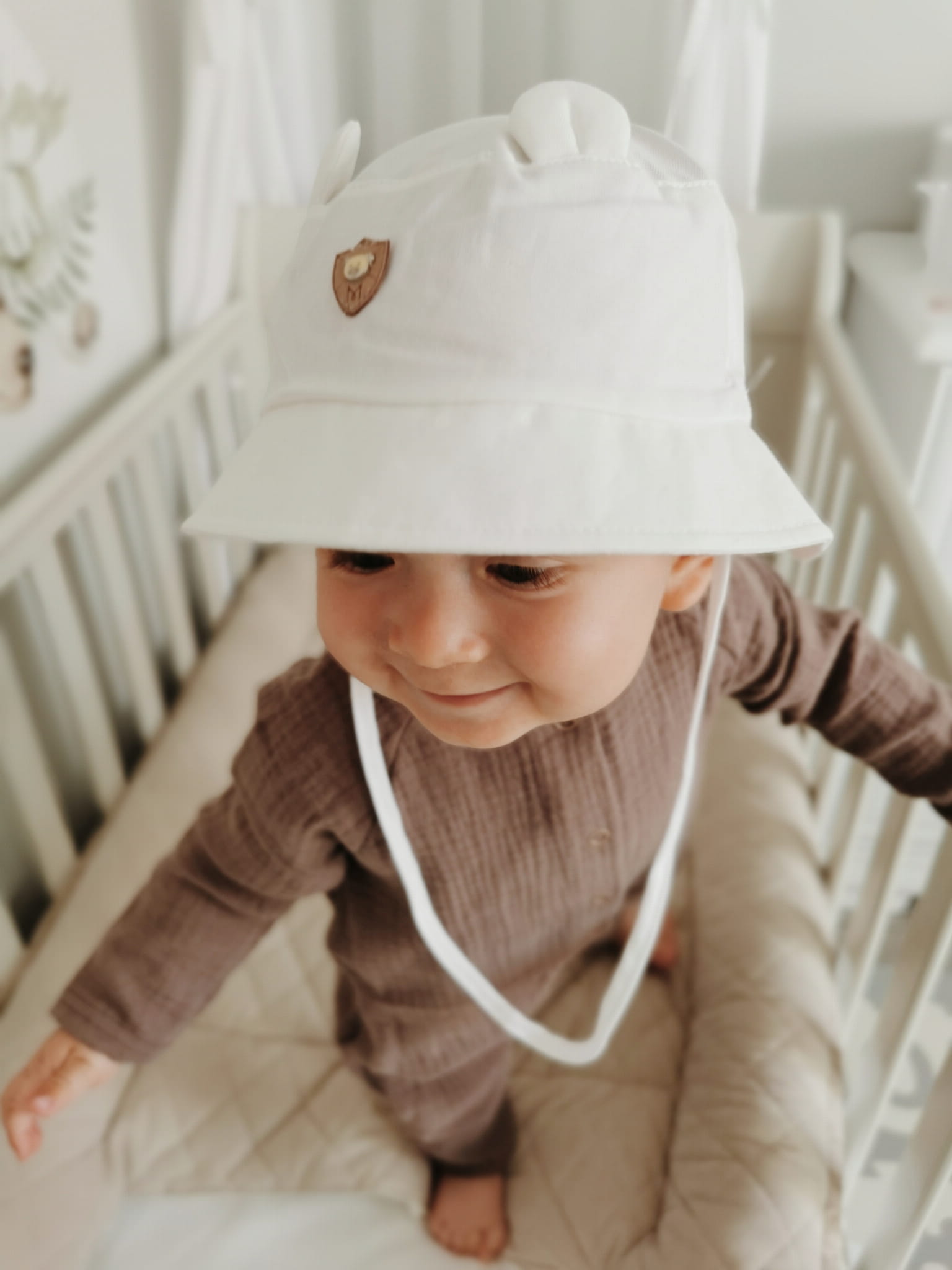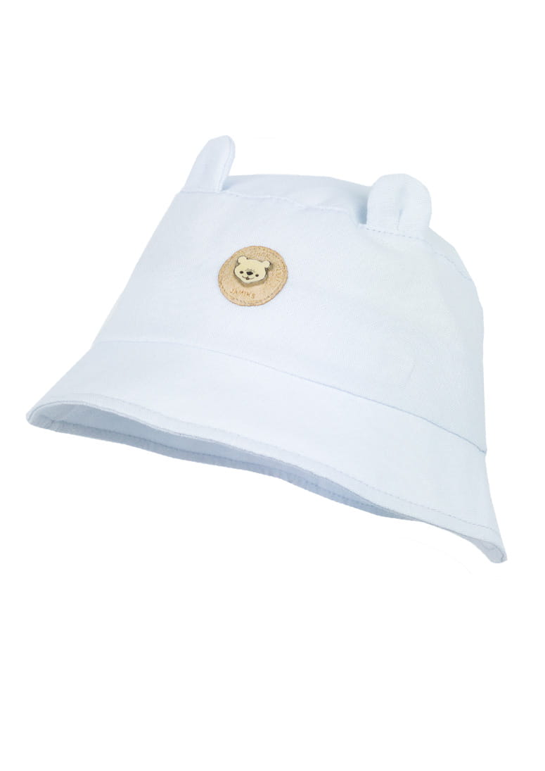 Kapelusz dla małego chłopca zdobiony uszkami misia oraz naszywką.