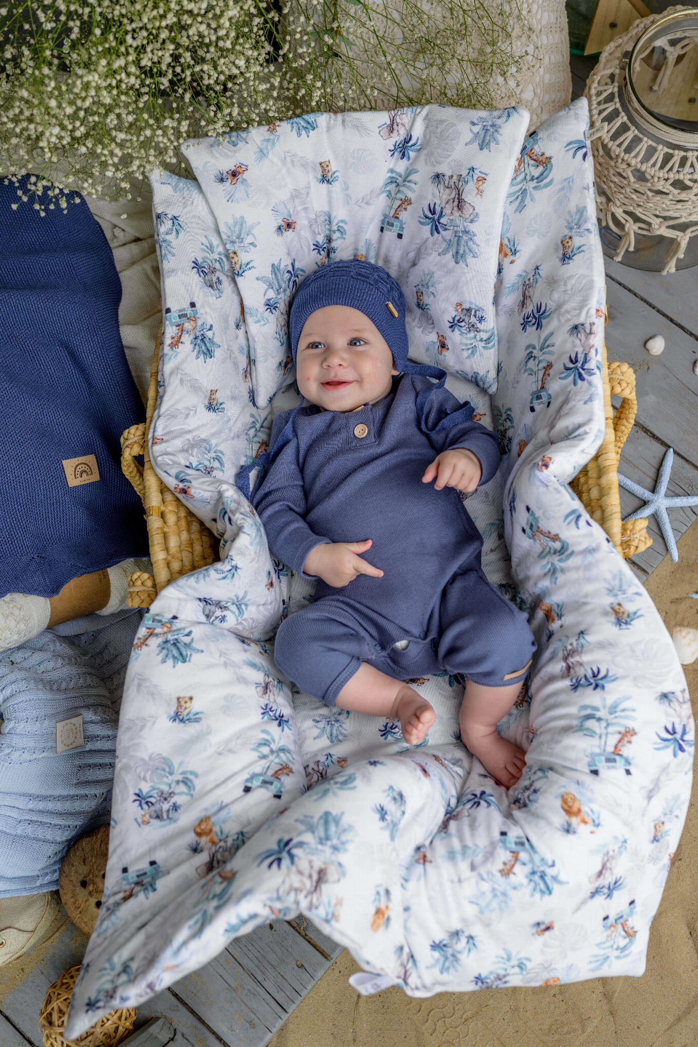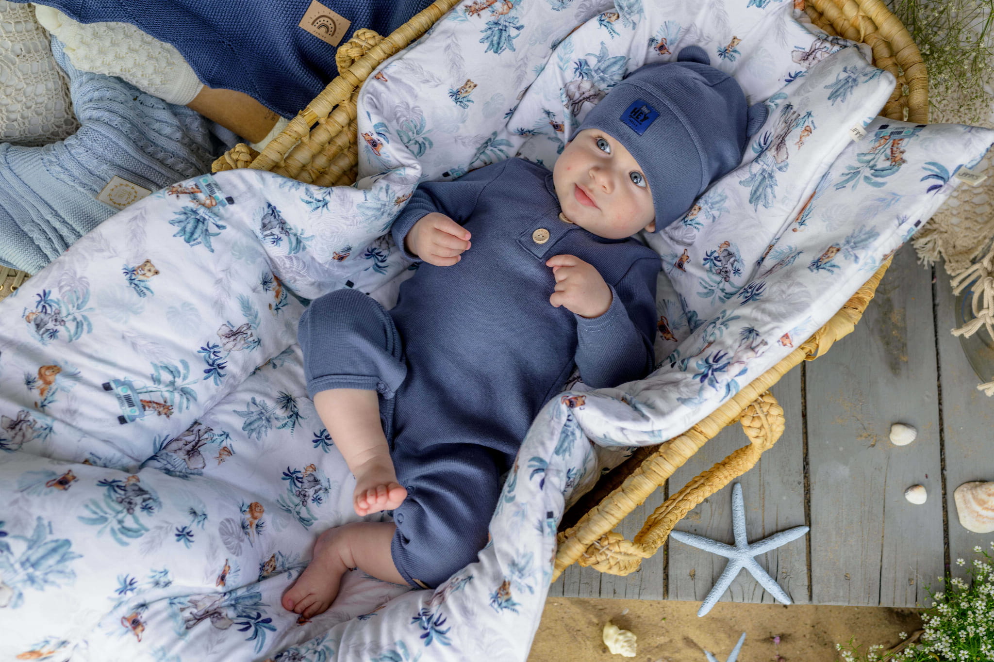 Wykonany z najwyższej jakości dzianiny bawełnianej, jest przyjemny w dotyku i bezpieczny dla skóry dziecka.