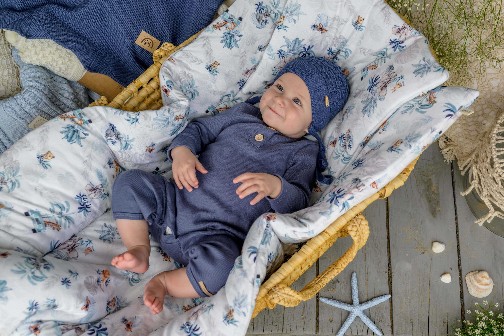 Wykonany z najwyższej jakości dzianiny bawełnianej, jest przyjemny w dotyku i bezpieczny dla skóry dziecka.