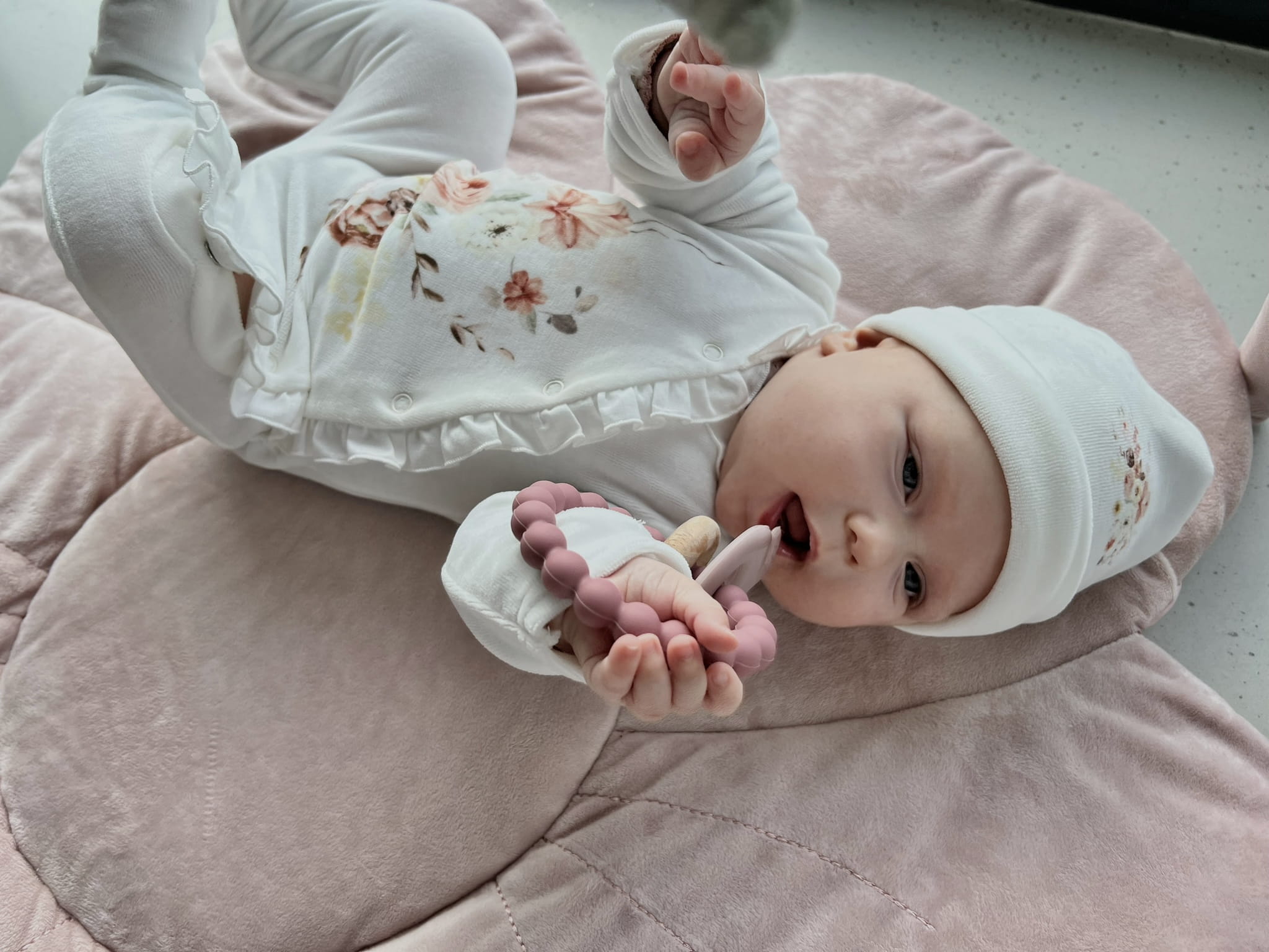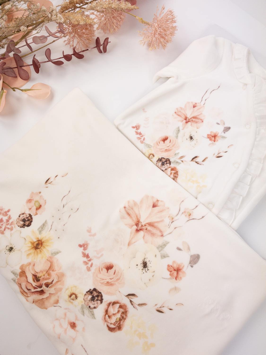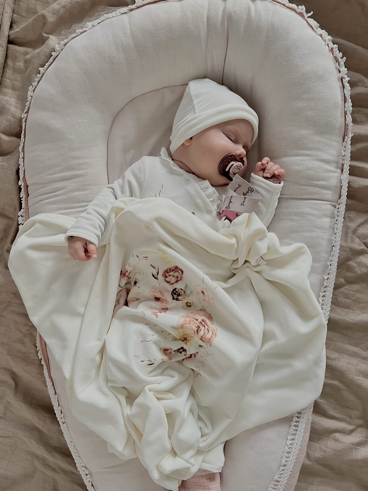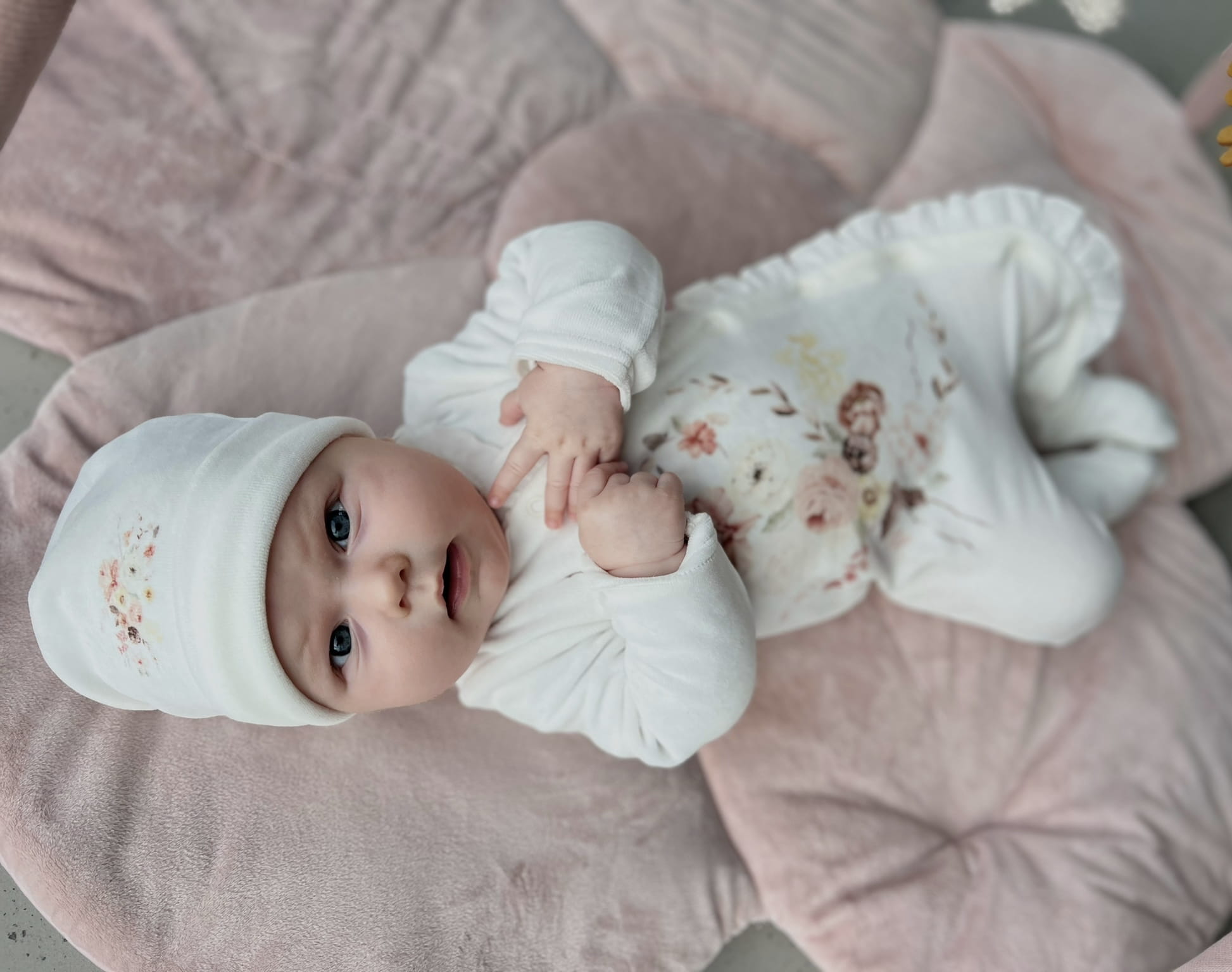 Czapka BEA może być idealnie skompletowana z zestawem, który zawiera pajacyk i otulacz. Pajacyk i otulacz wykonane są z tych samych materiałów co czapka, co zapewnia spójny wygląd i wysoki komfort noszenia dla maluszka.