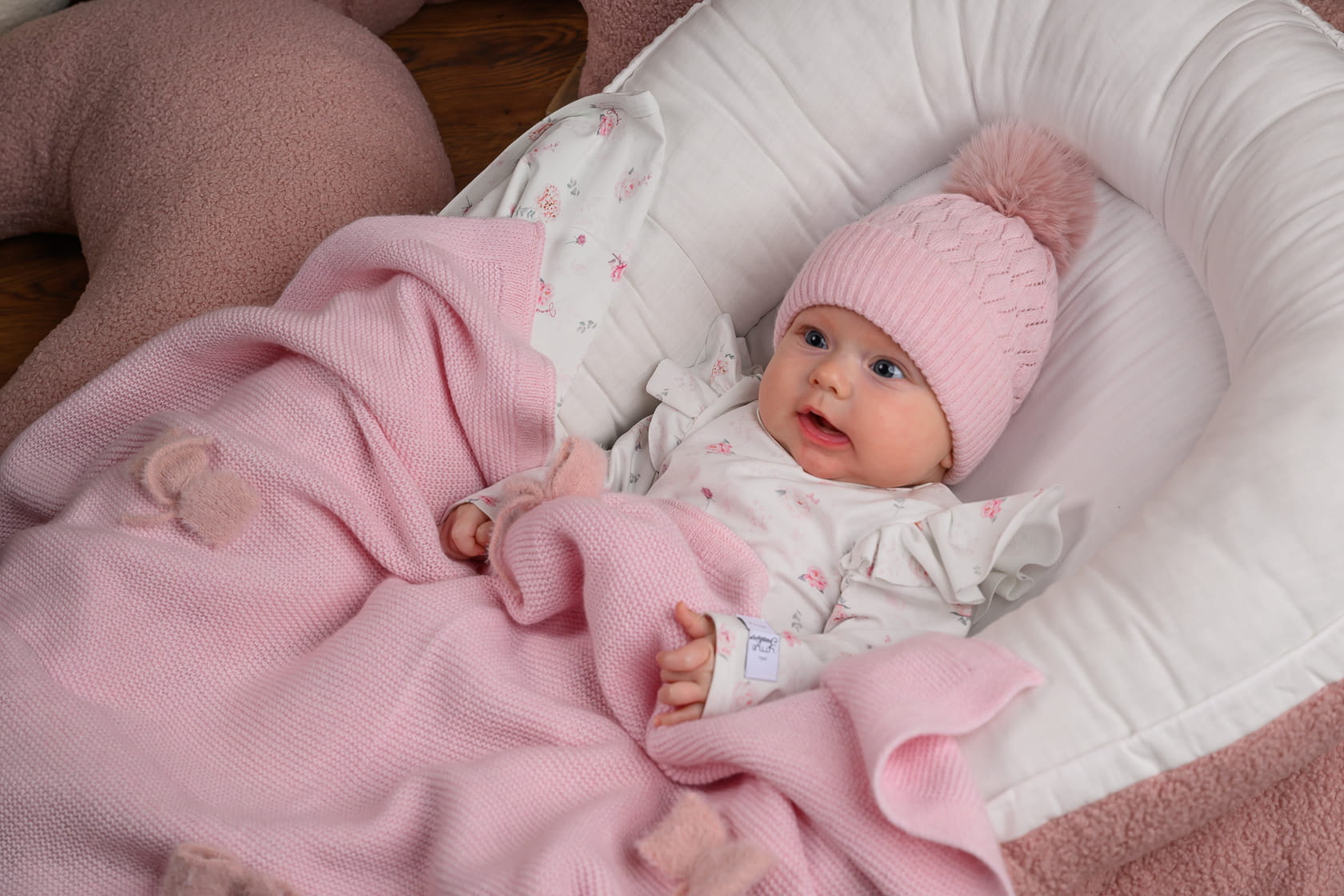 Bardzo delikatna, ciepła i miła w dotyku czapka na zimę dla małej dziewczynki.