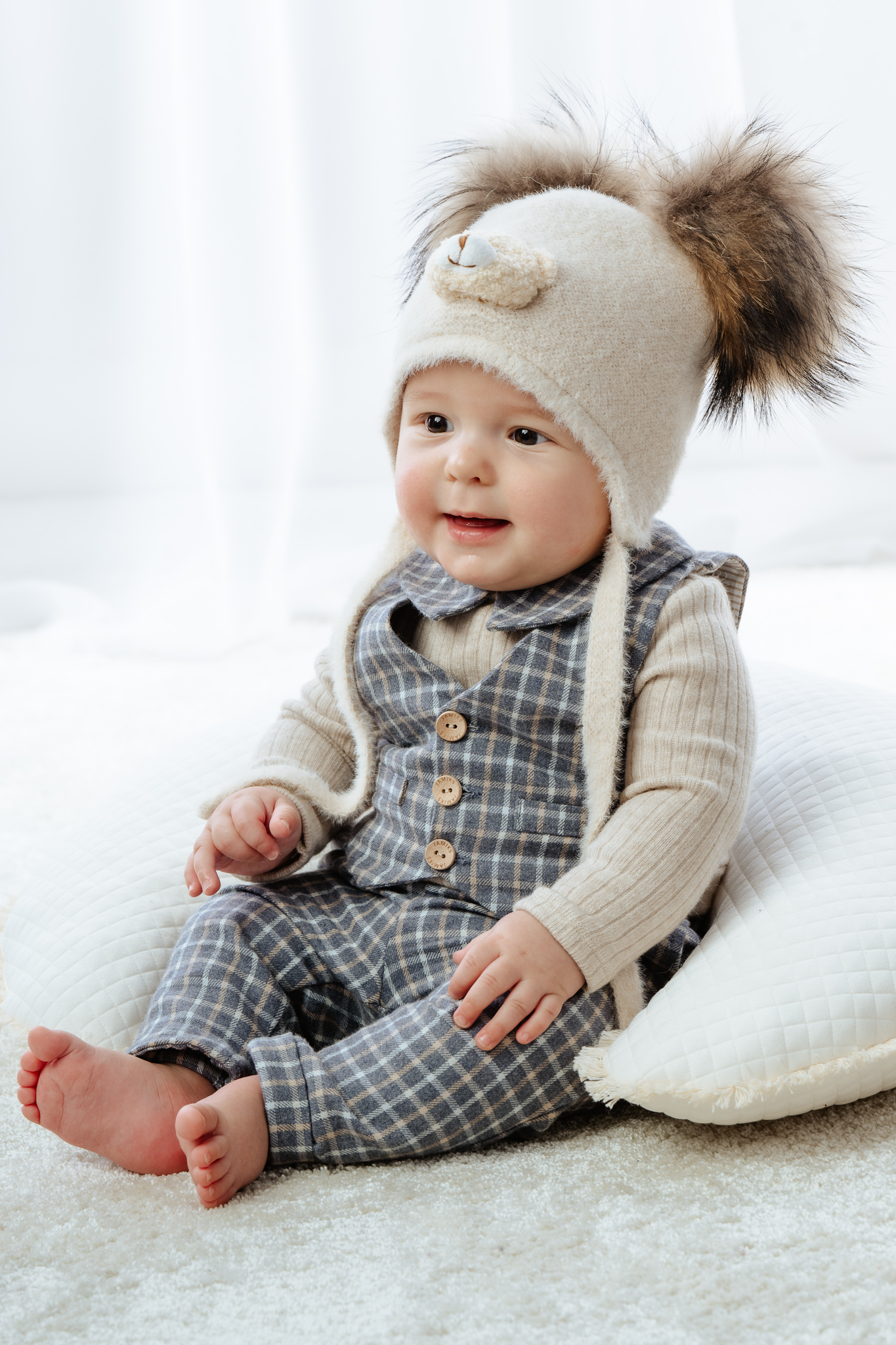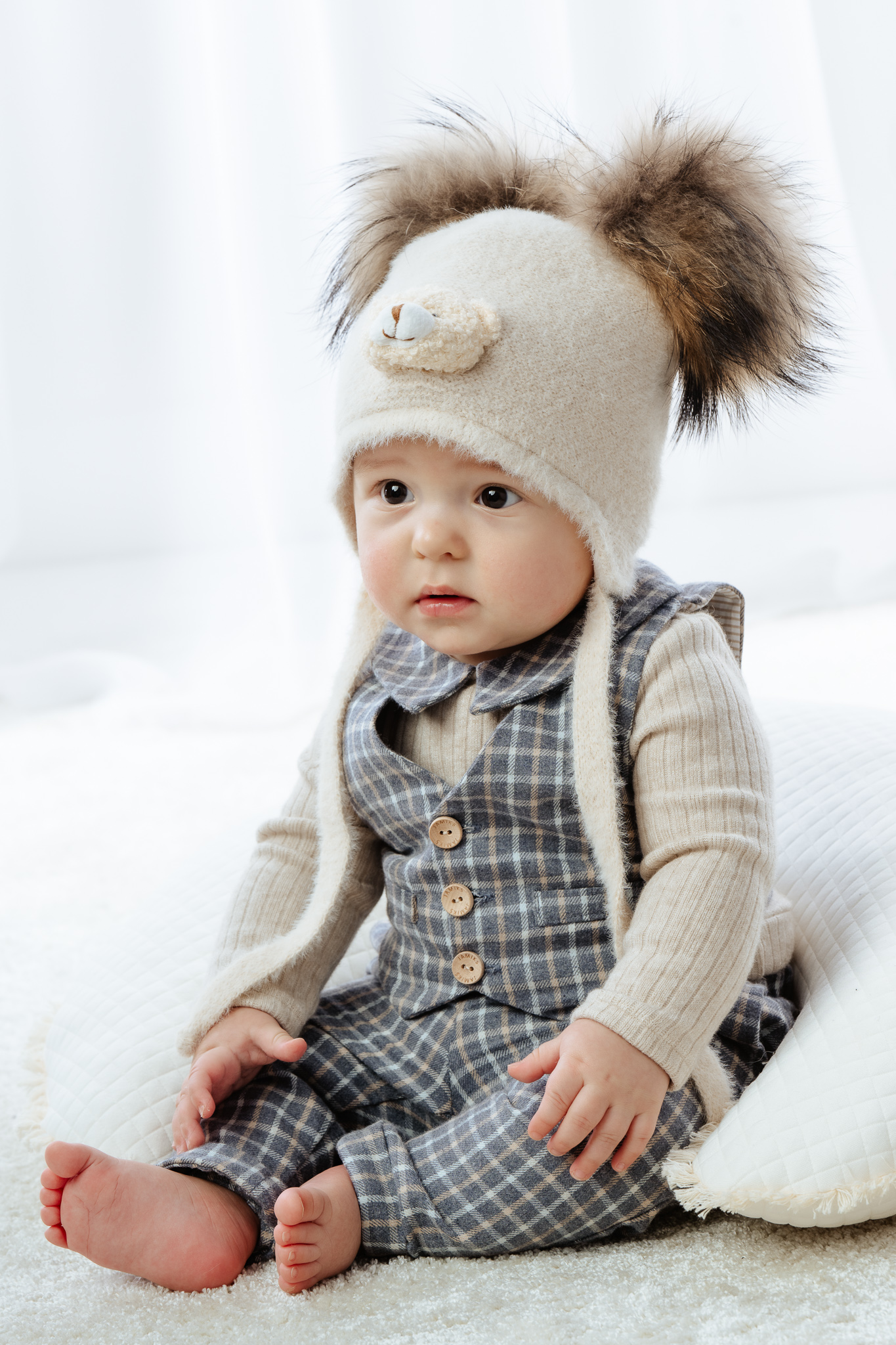 dwa puszyste pompony z futra syntetycznego – dodają uroku i dziecięcego charakteru,