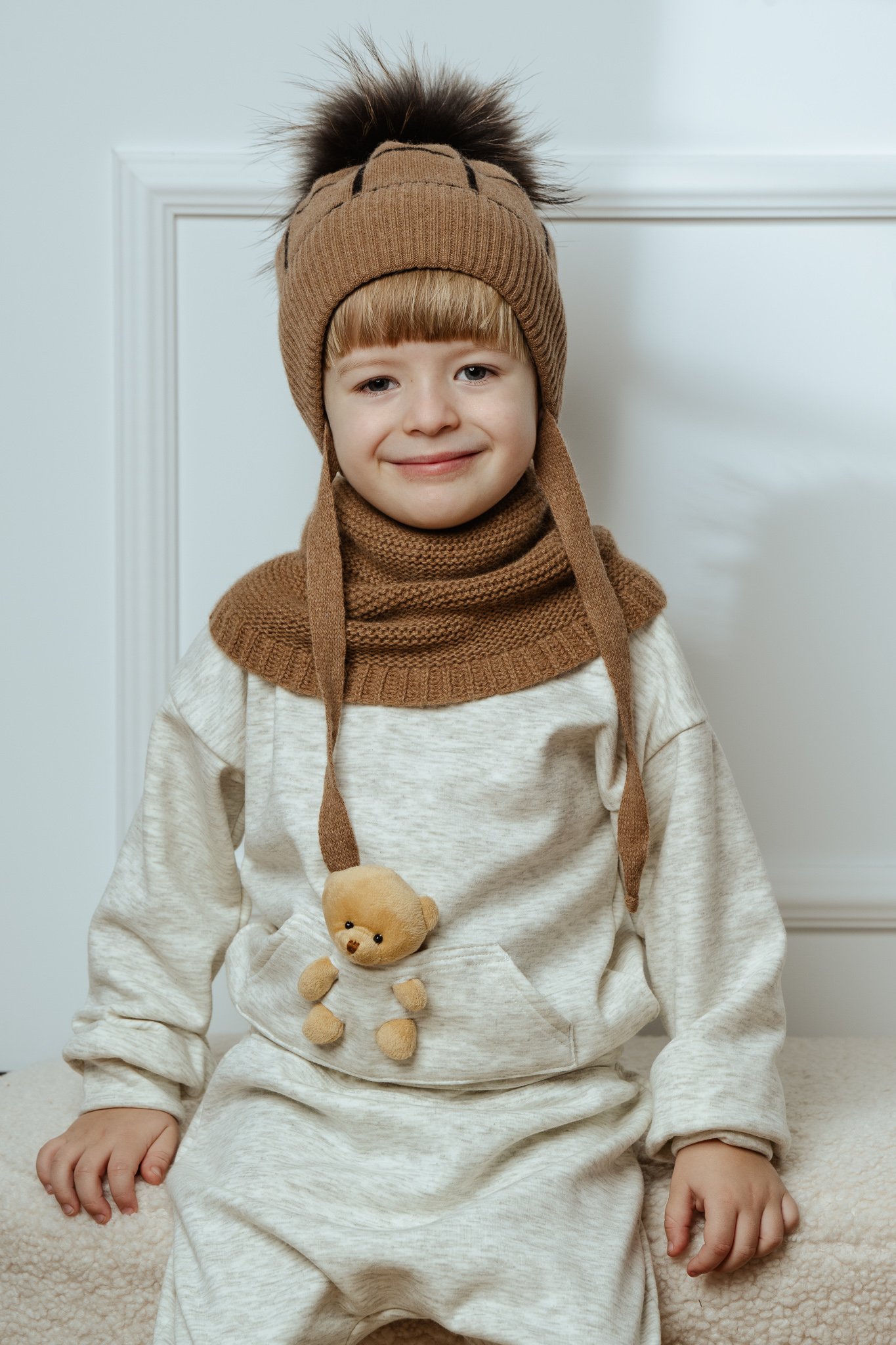 Sztuczny pompon nadaje czapce dekoracyjnego charakteru, a wiązanie pod szyją gwarantuje stabilne dopasowanie, chroniąc przed wiatrem i chłodem. DAGGET idealnie sprawdzi się podczas spacerów i zimowych zabaw na świeżym powietrzu.