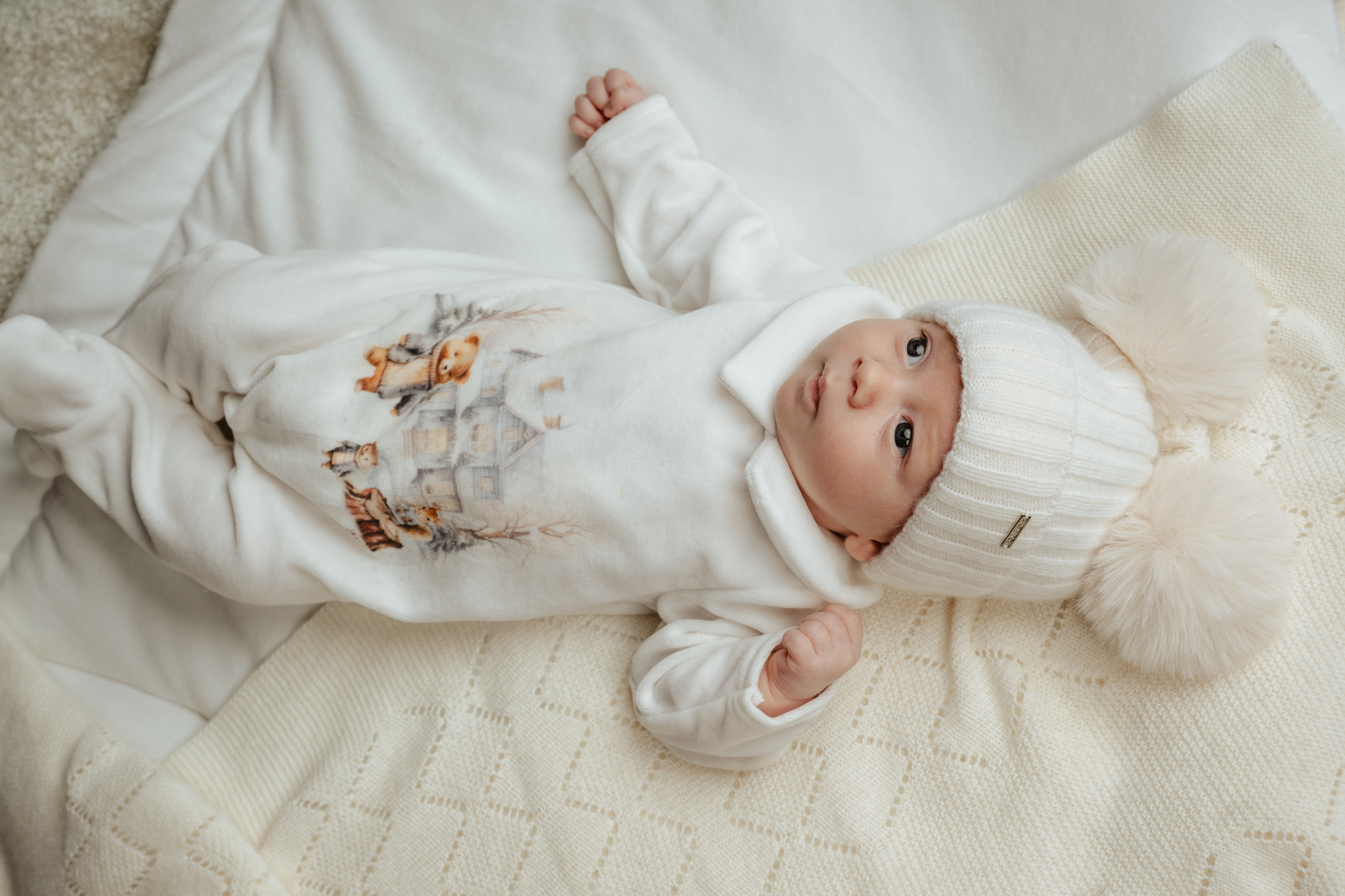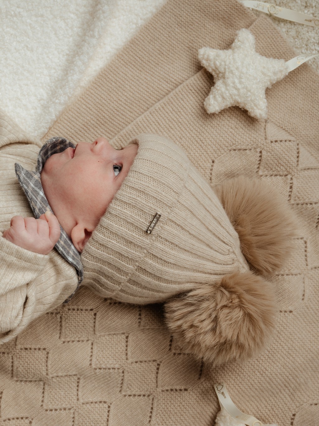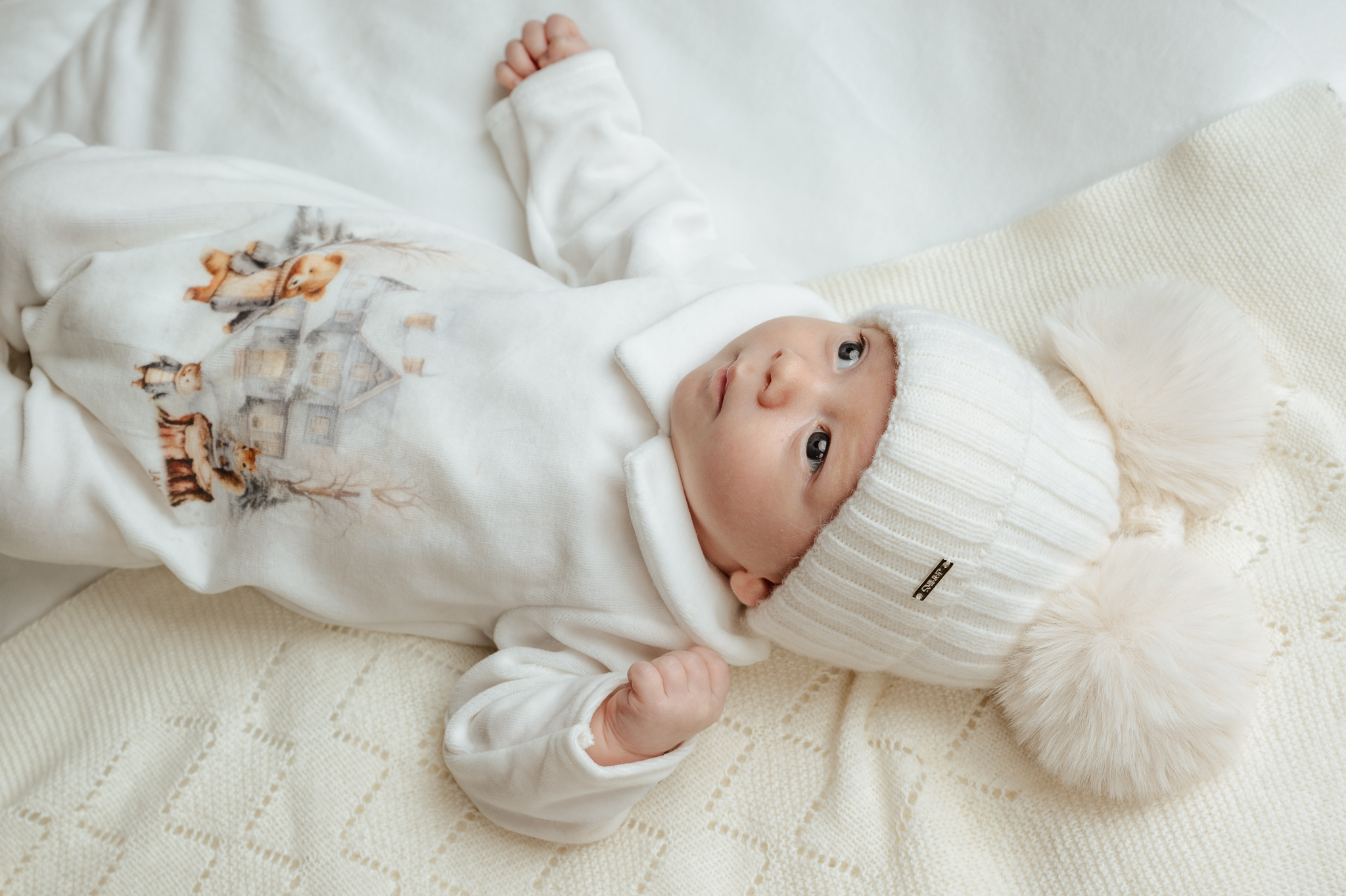 dwa puszyste pompony z futra syntetycznego – dodają czapce dziecięcego uroku,