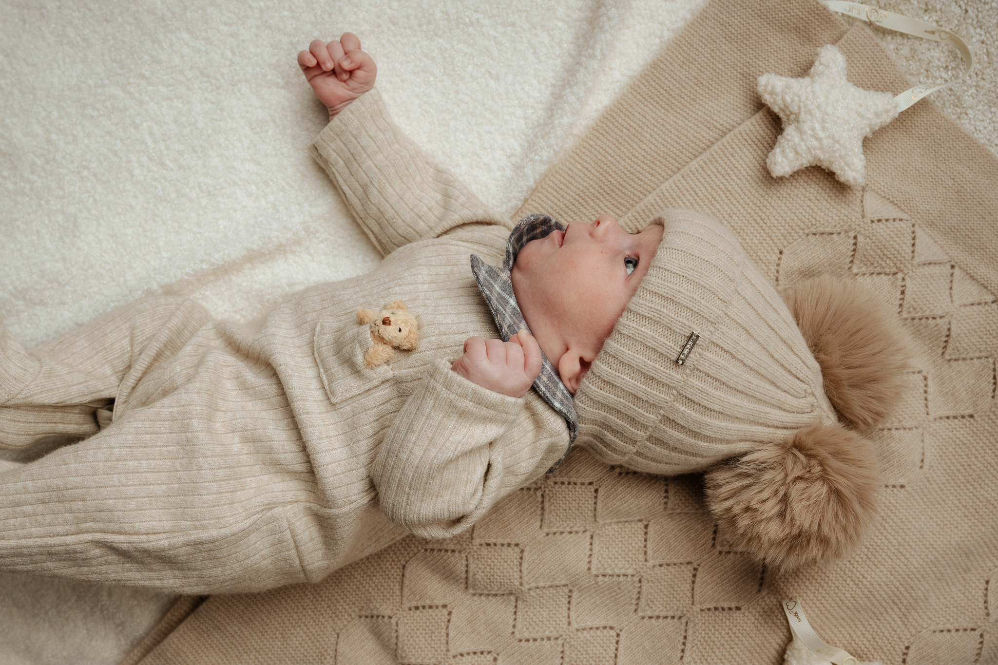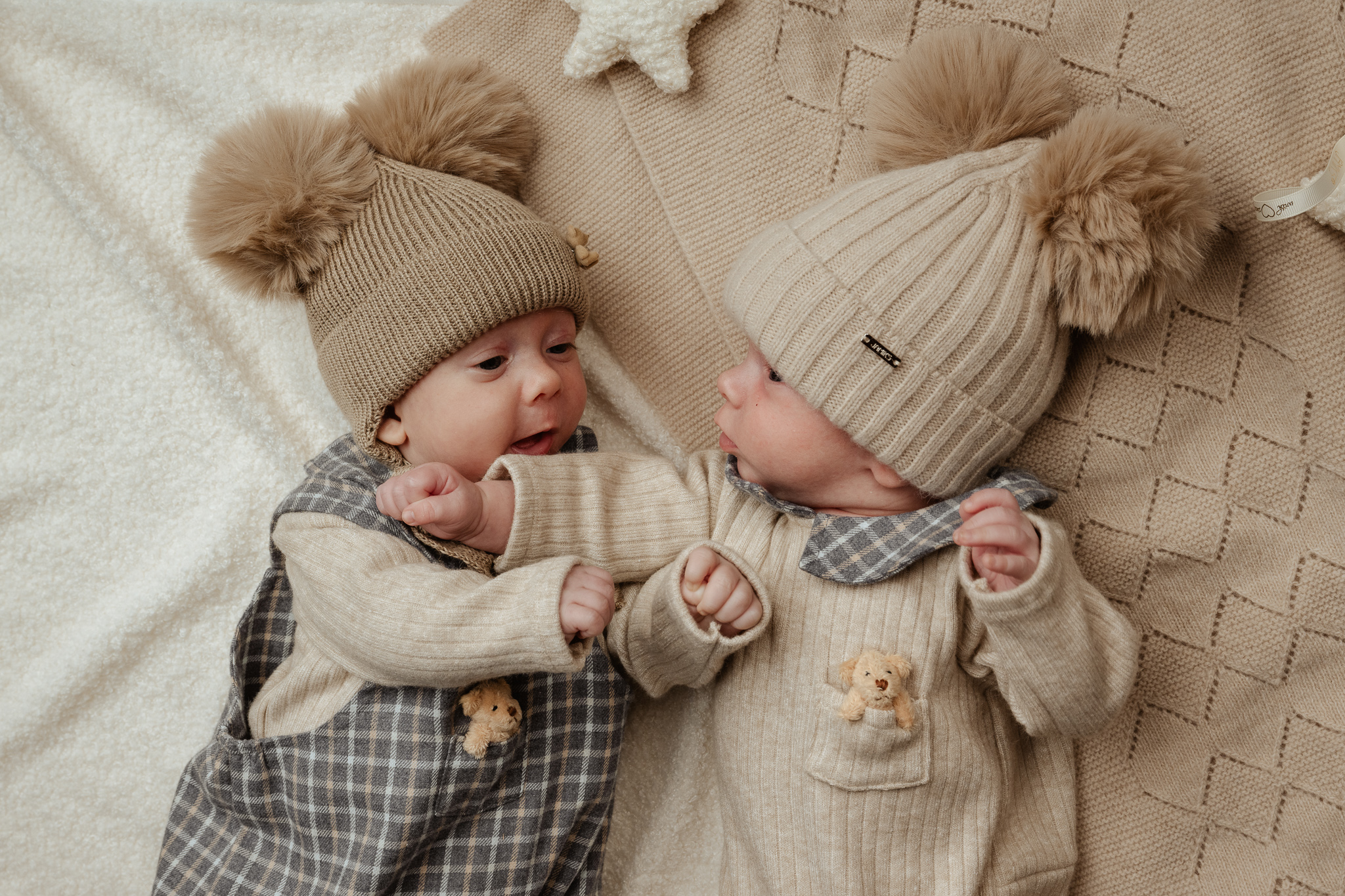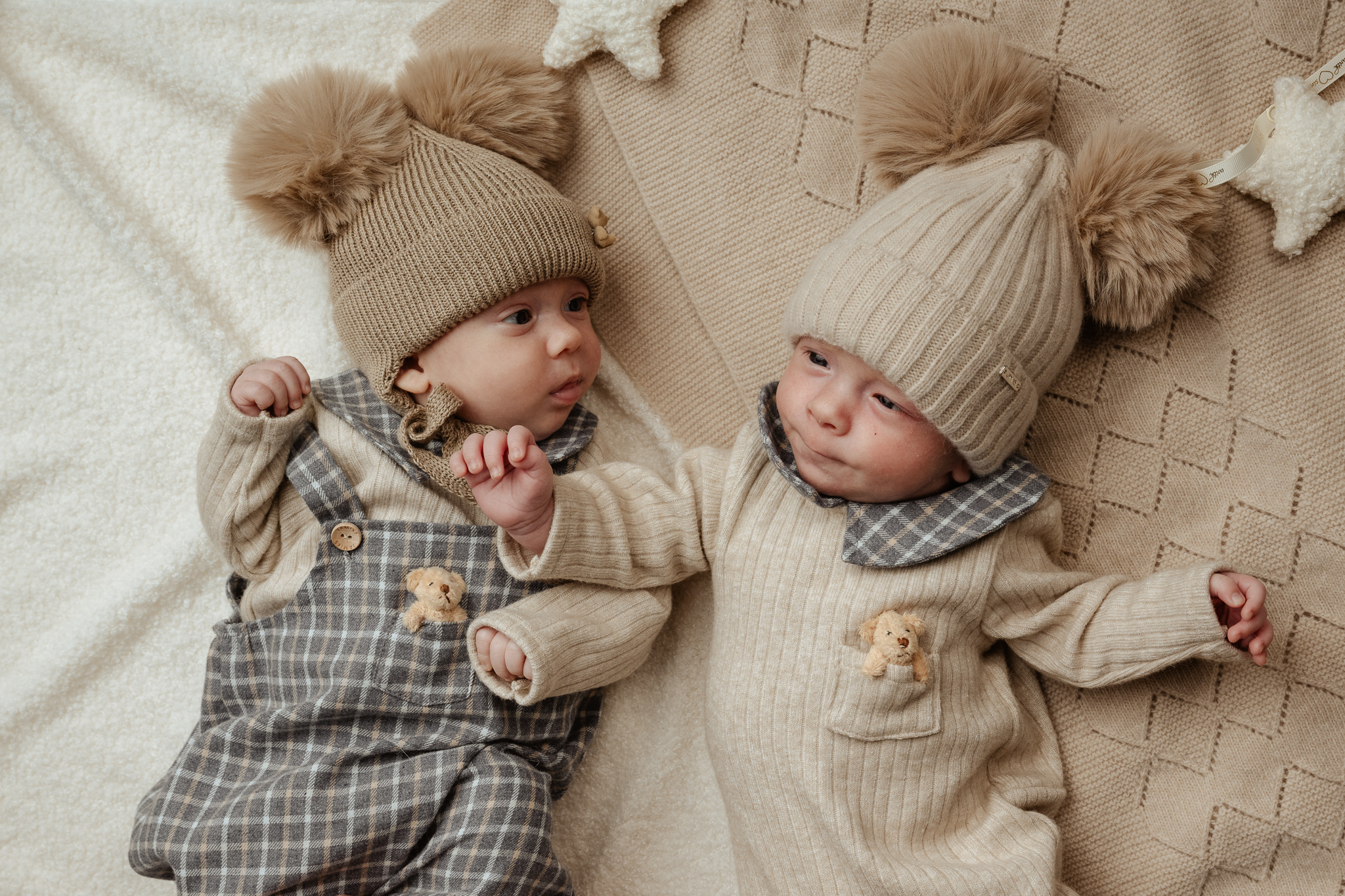 dwa puszyste pompony z futra syntetycznego – dodają czapce dziecięcego uroku,