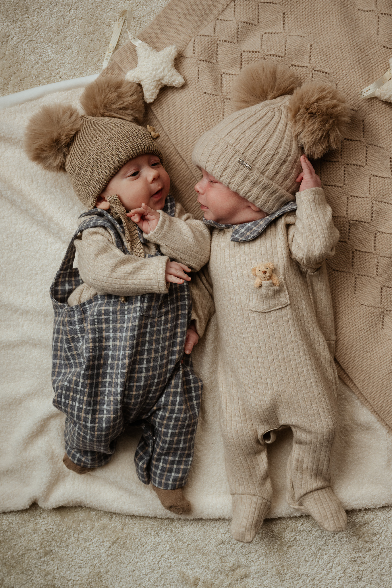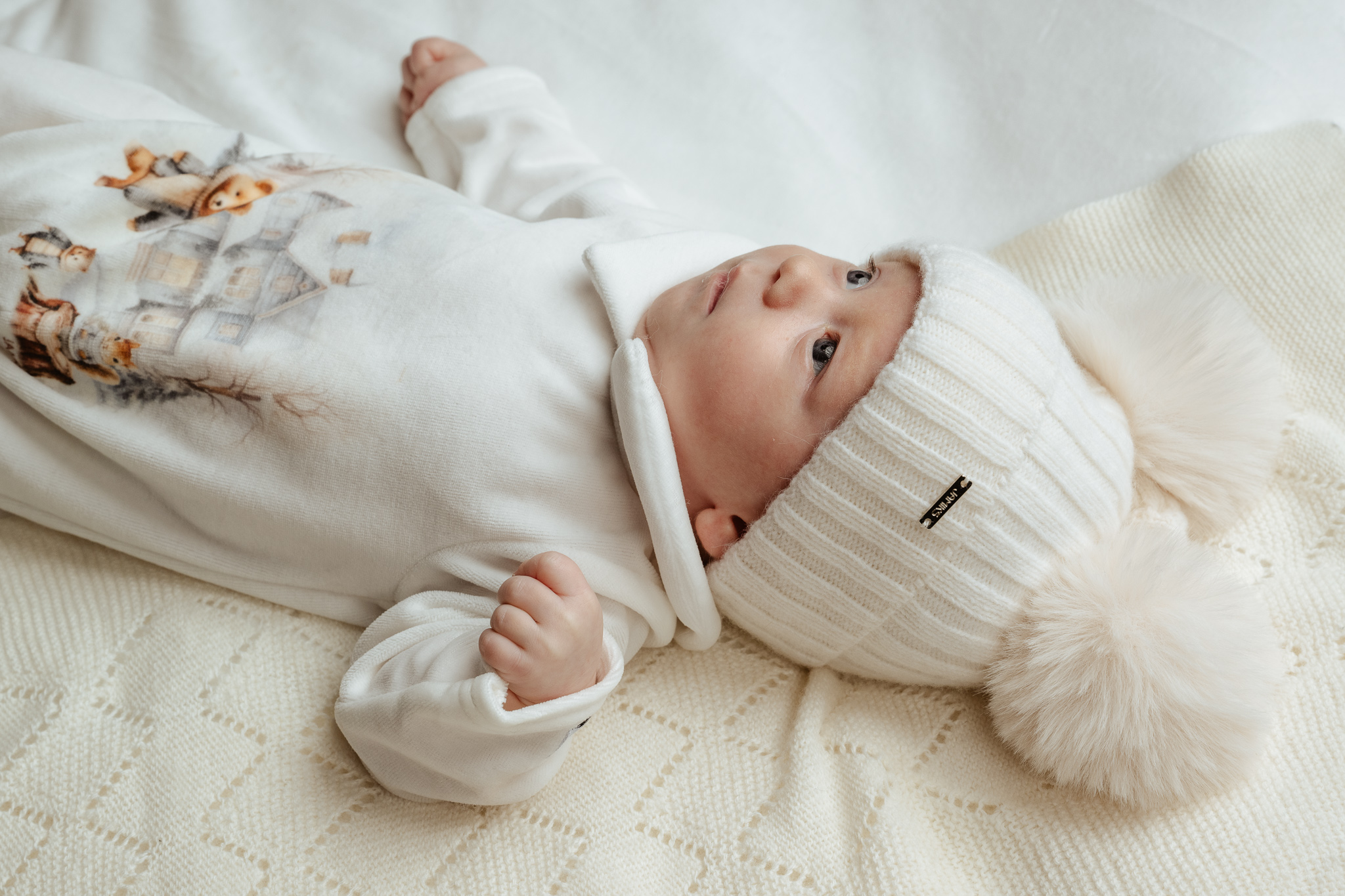 dwa puszyste pompony z futra syntetycznego – dodają czapce dziecięcego uroku,