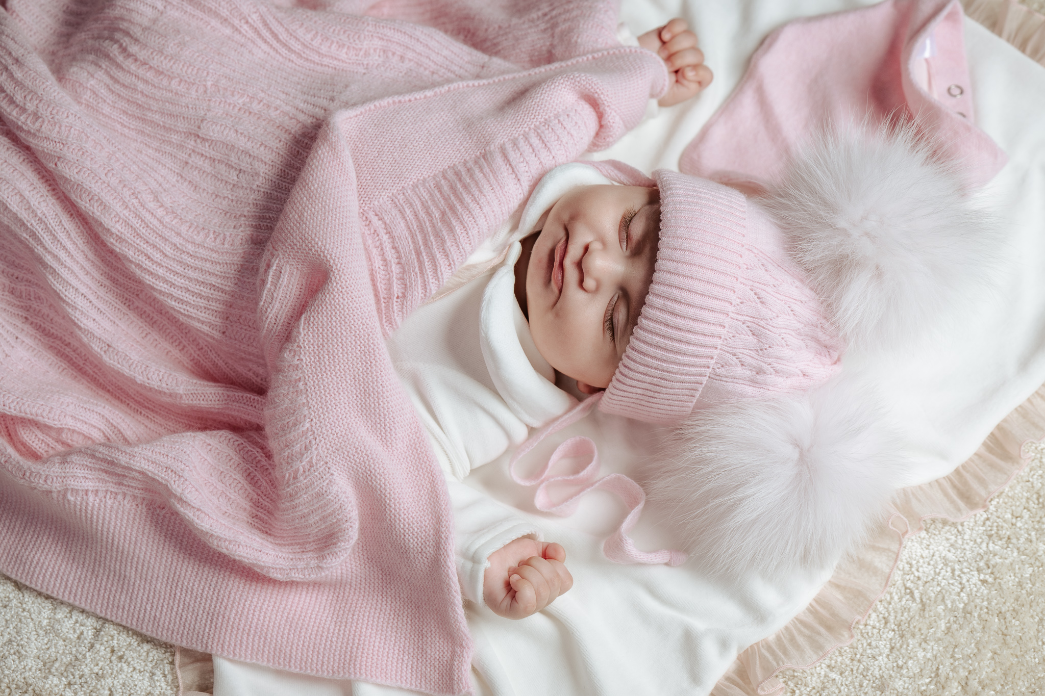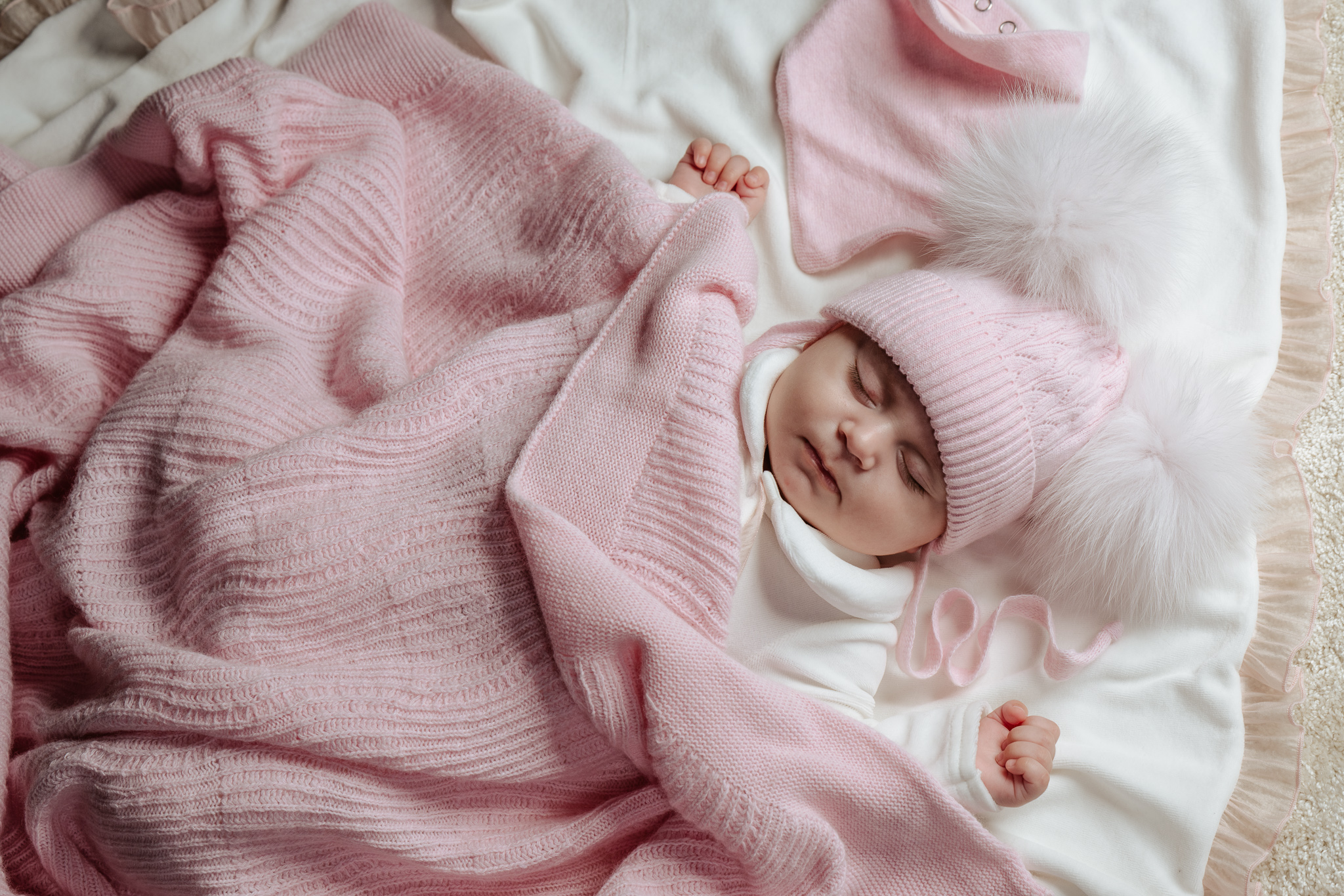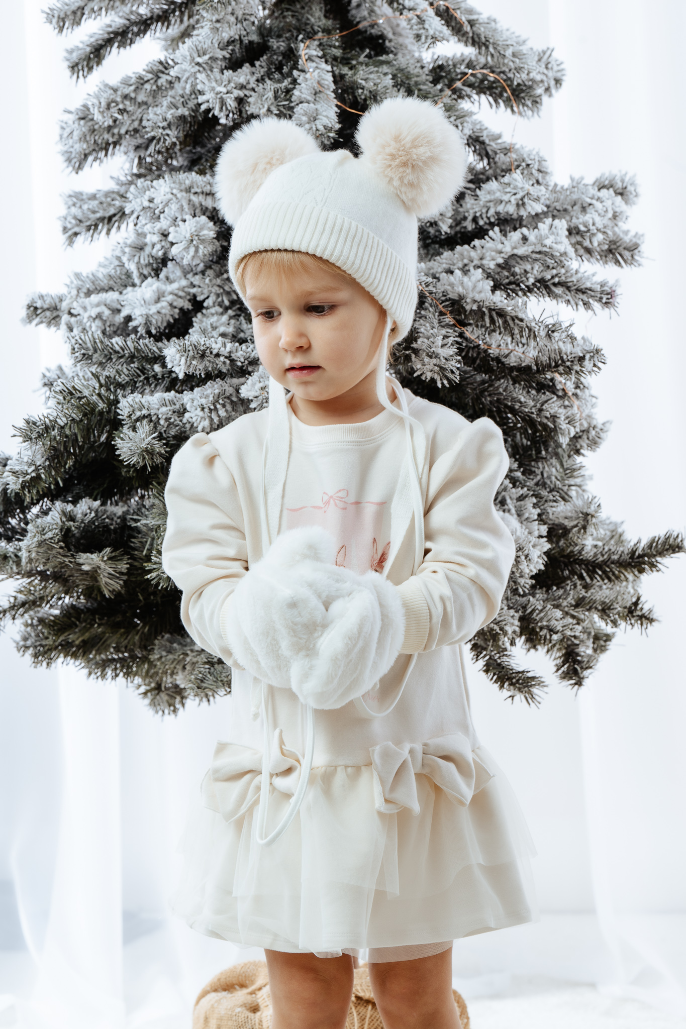 dwa puszyste pompony z futra syntetycznego – dodają uroku i dziewczęcego charakteru,