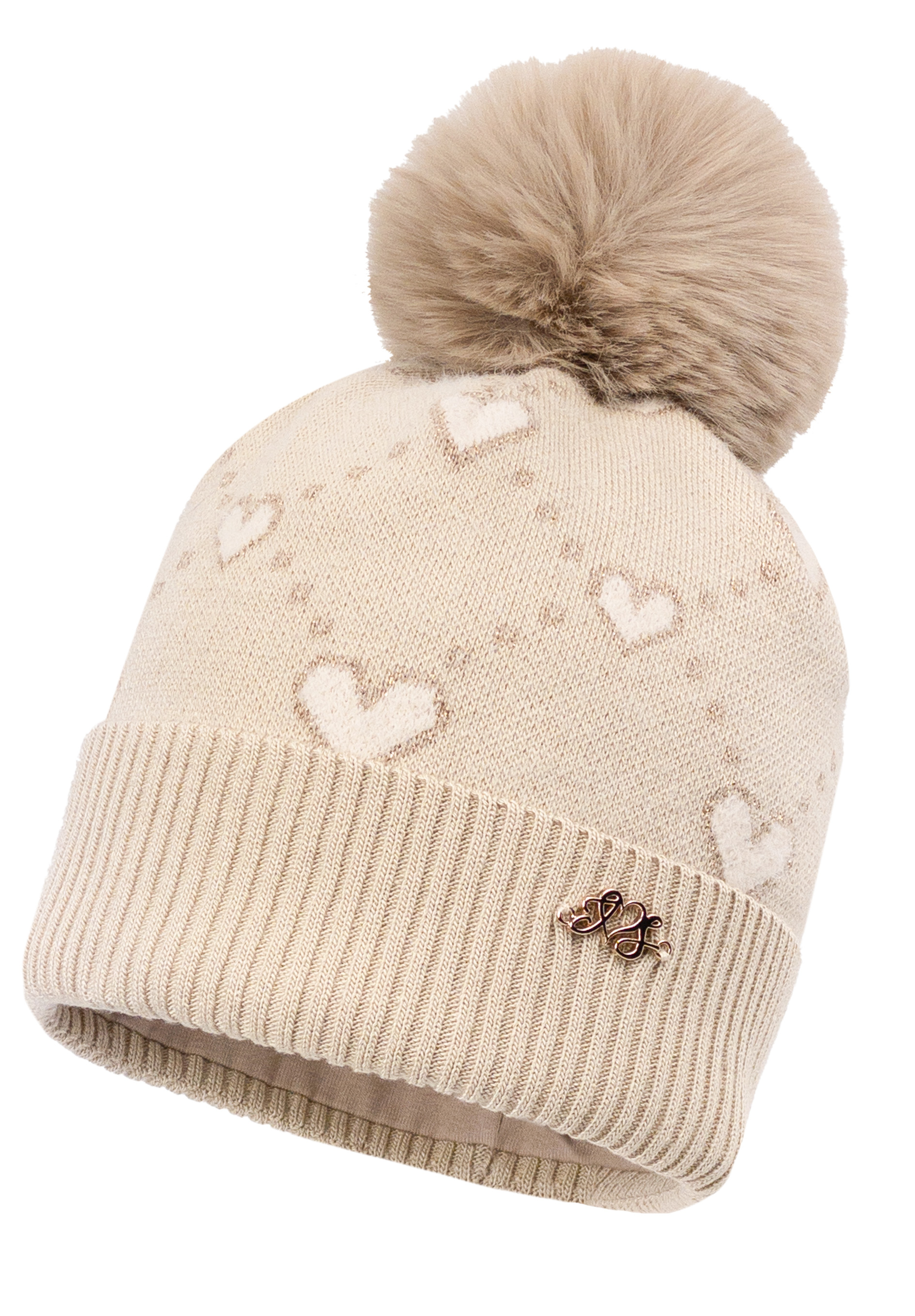 Dziewczęca czapka zimowa MARILLA z pomponem, wzorem w serduszka i połyskującą nitką, z delikatną bawełnianą podszewką.