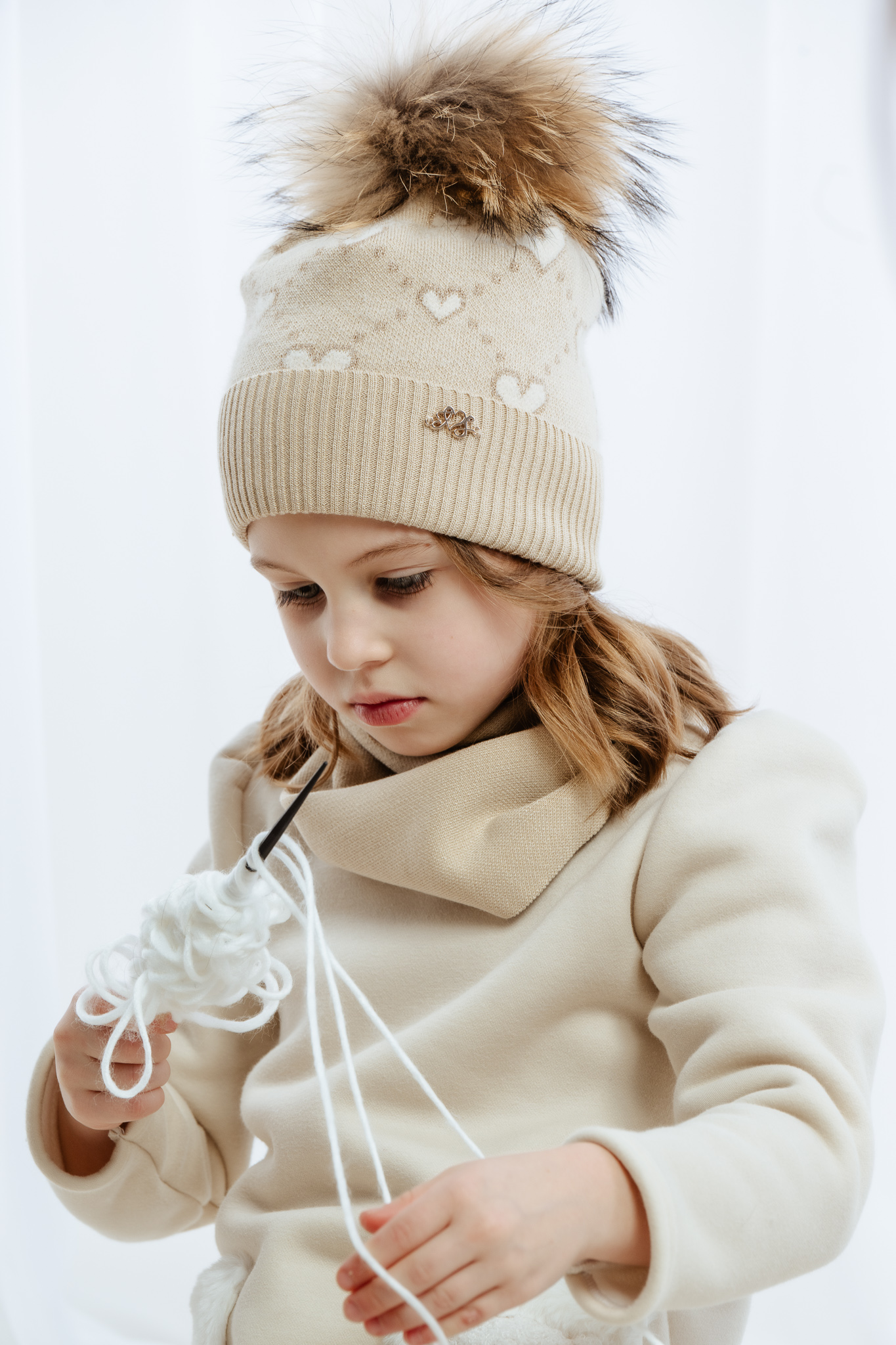 Czapka dla dziewczynki na zimę MARILLA z pomponem jasny beż