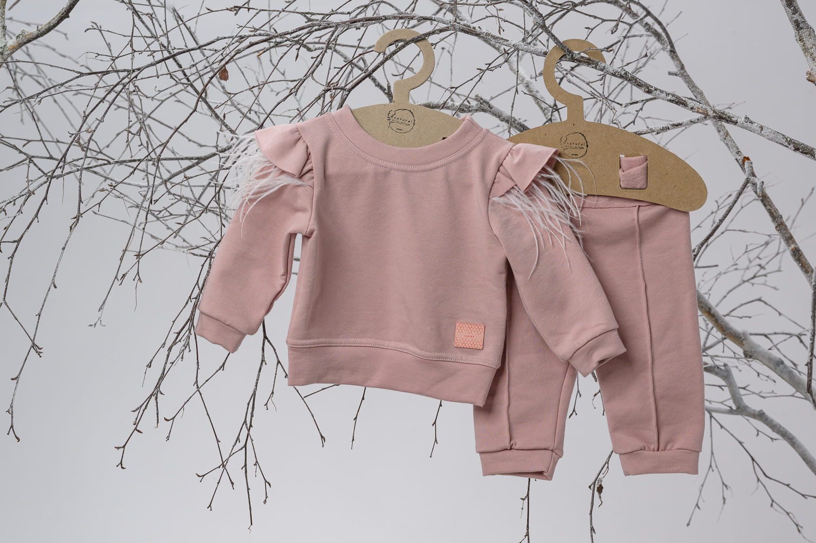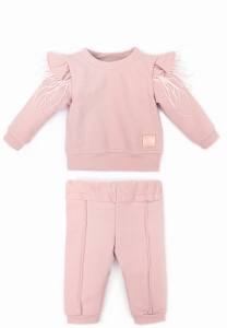 Dresik CARINA składa się z dwóch części: bluzy i spodni. Bluza posiada zdobione rękawki falbanką i piórkami, co nadaje jej uroku i dziewczęcego wyglądu. Te urocze detale dodają dresikowi indywidualności i kreatywnego stylu.