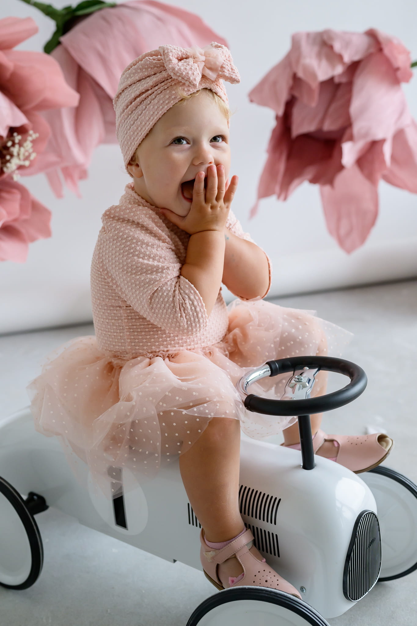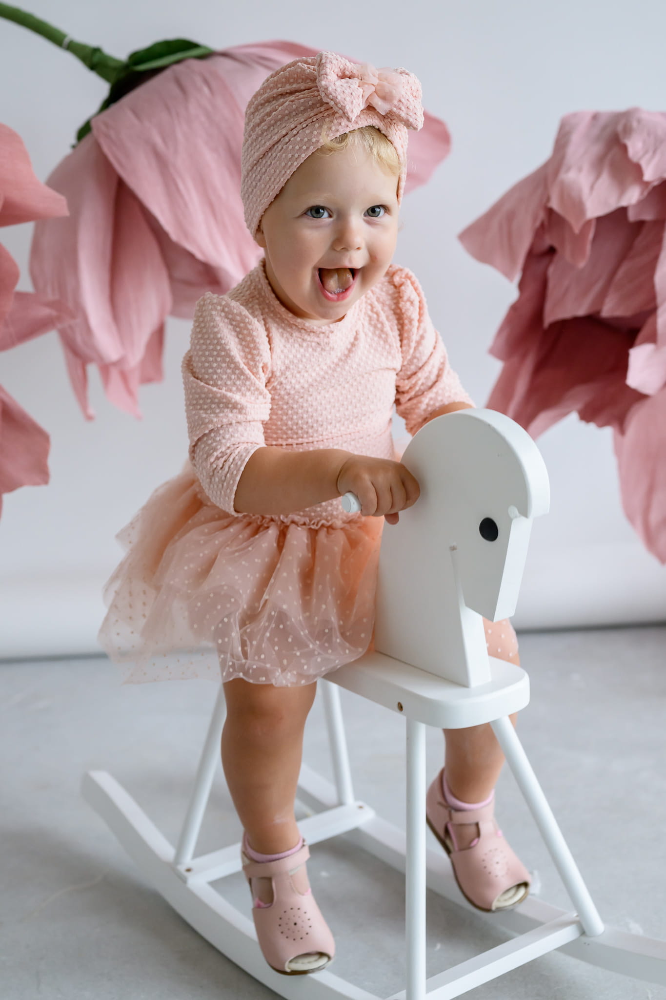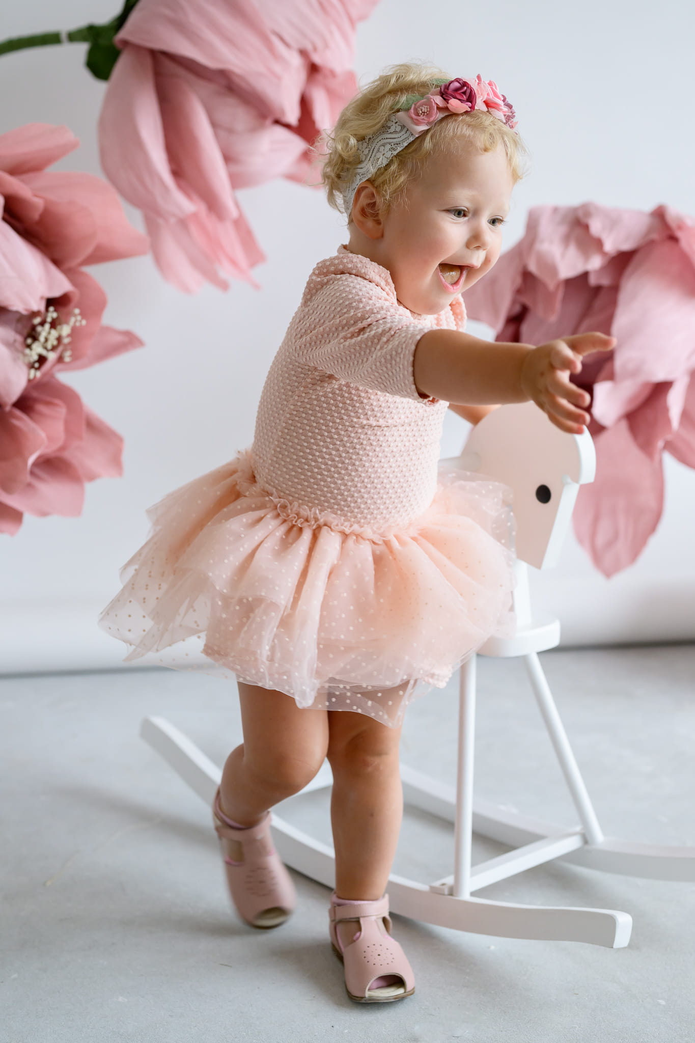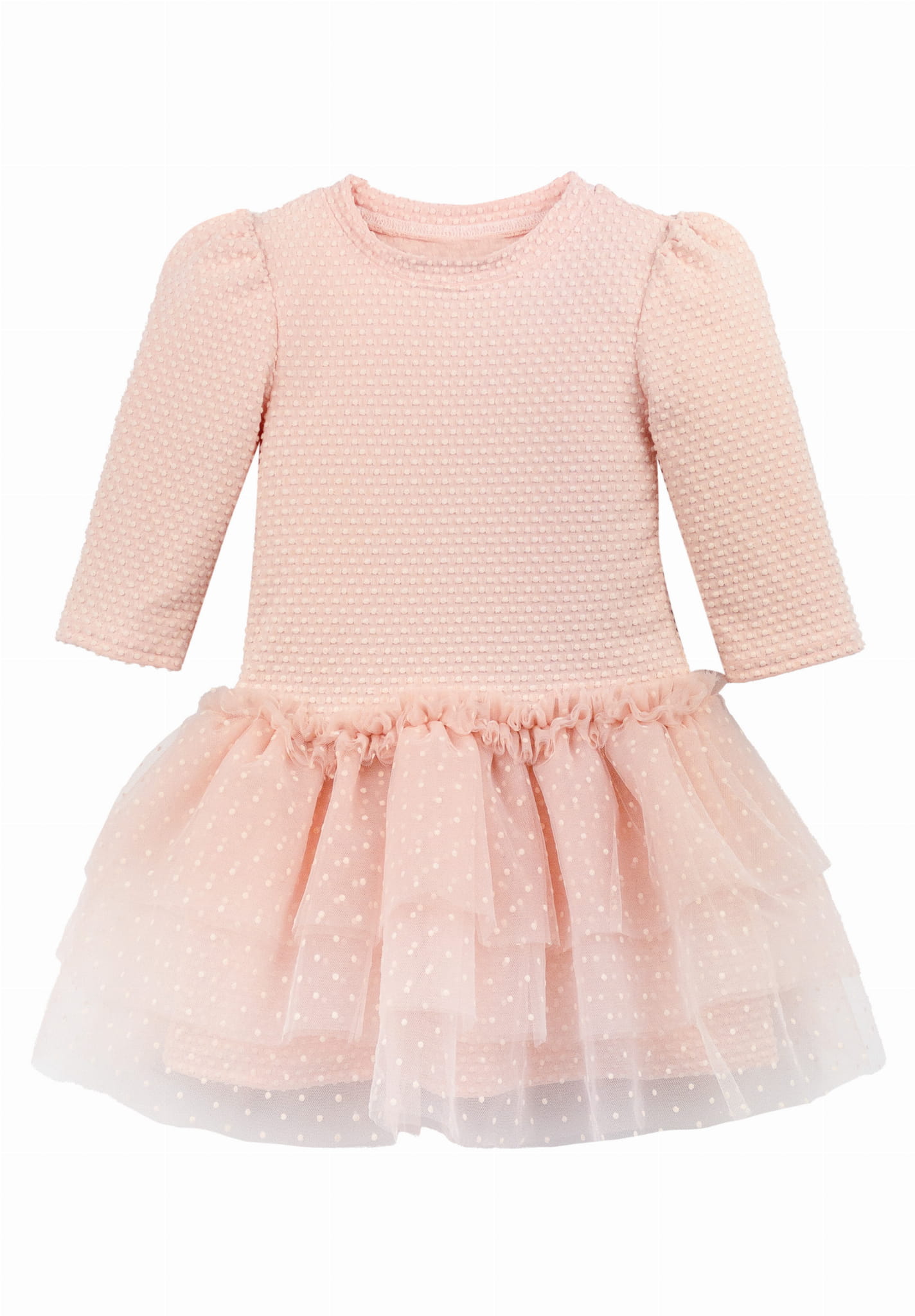 Sukienka dla dziewczynki na wiosenne dni. Zdobiona gęstym tiulem, dzięki czemu wygląda jak sukienka baletnicy.