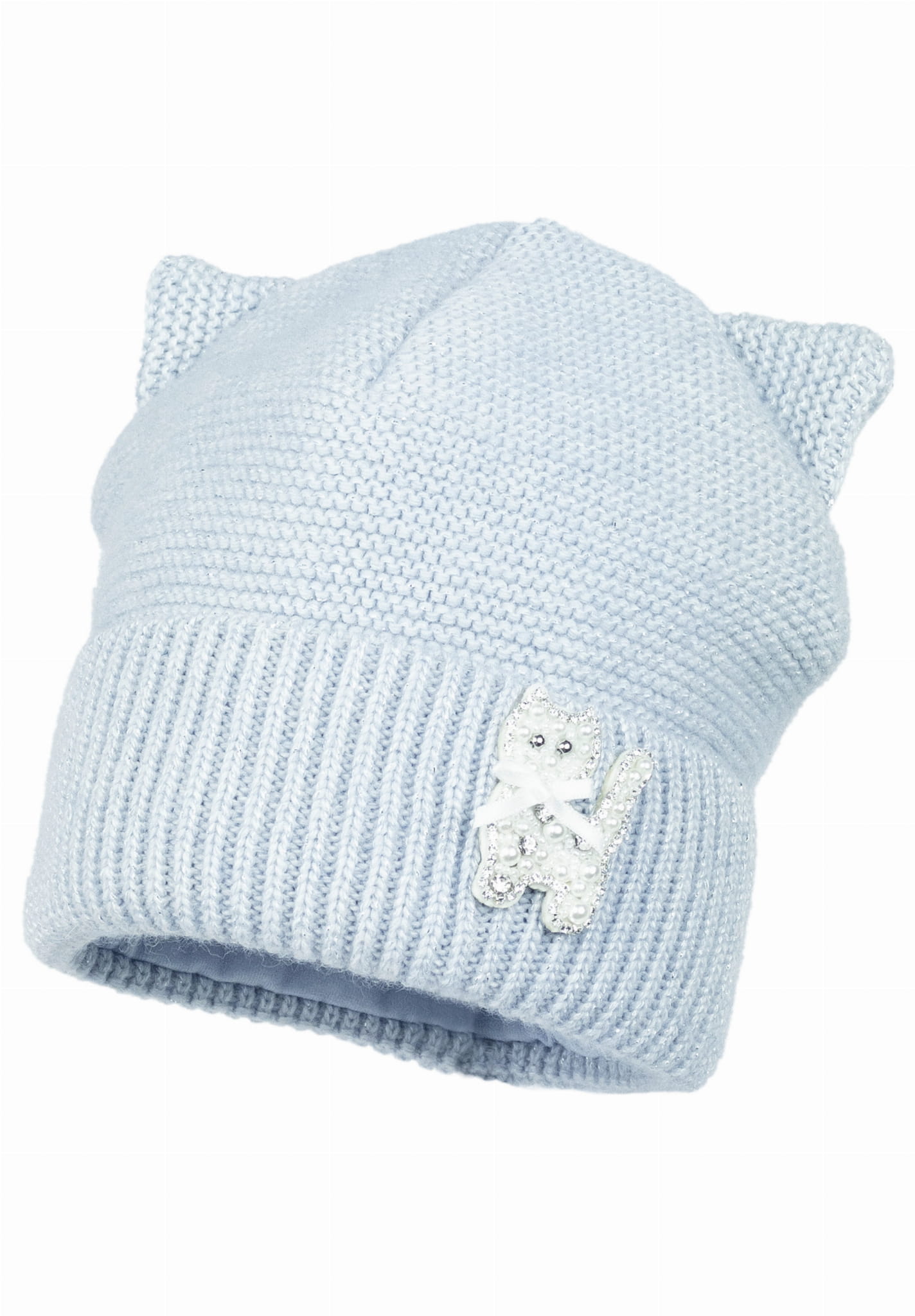 Ciepła czapka dla małej dziewczynki zdobiona uszkami kotka i połyskującą aplikacją.