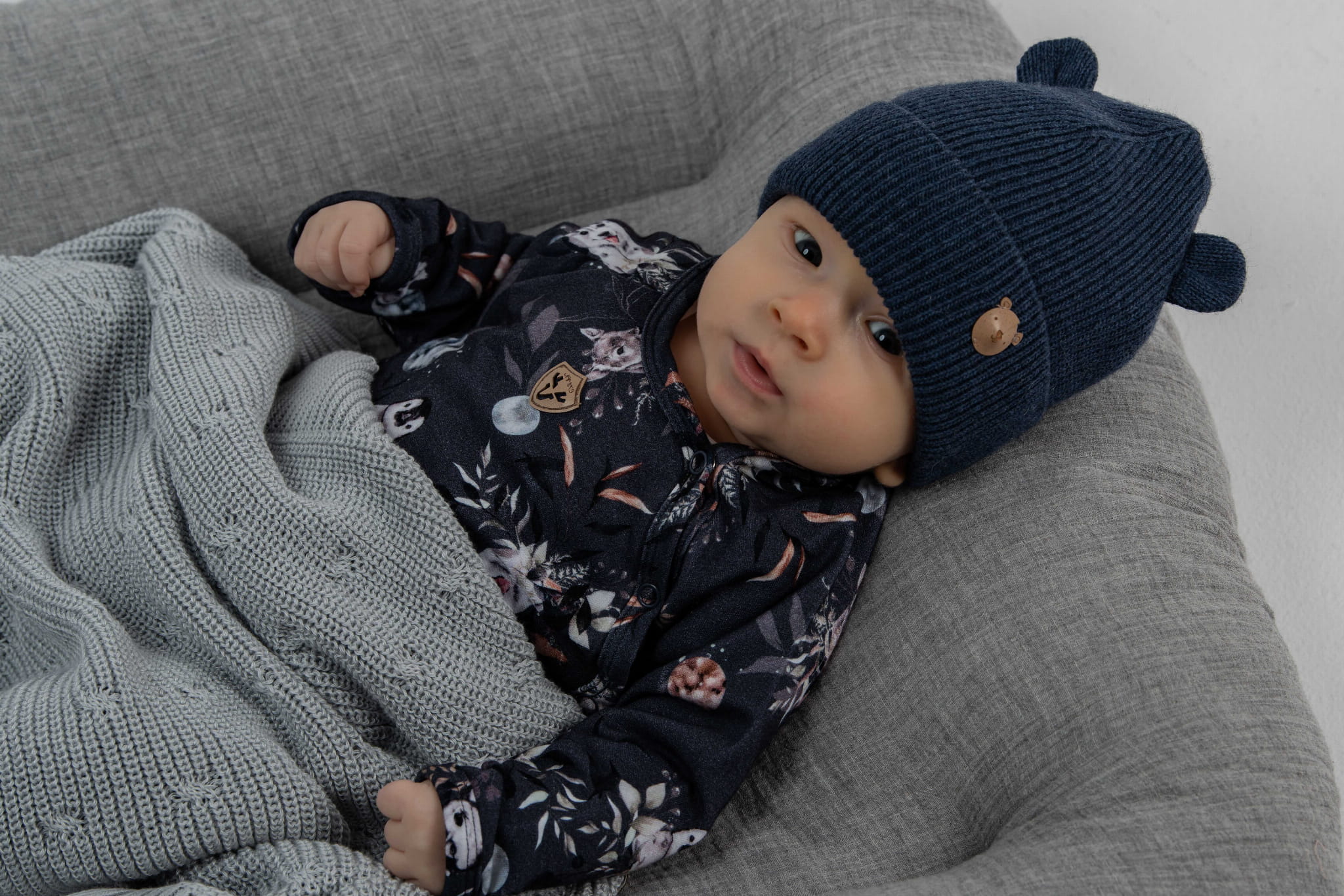 Zdobiona uszkami, wywinięcie dodatkowo chroni uszy dziecka przed wiatrem i mrozem.