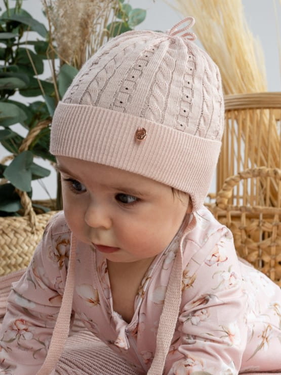 Czapka wyposażona jest w wiązanie pod szyją, co nie tylko dodaje uroku, ale także zapewnia pewne dopasowanie do głowy dziecka i zapobiega zsuwaniu się czapki. Ten praktyczny element sprawia, że czapka jest wygodna i stabilnie osadzona na główce dziecka.
