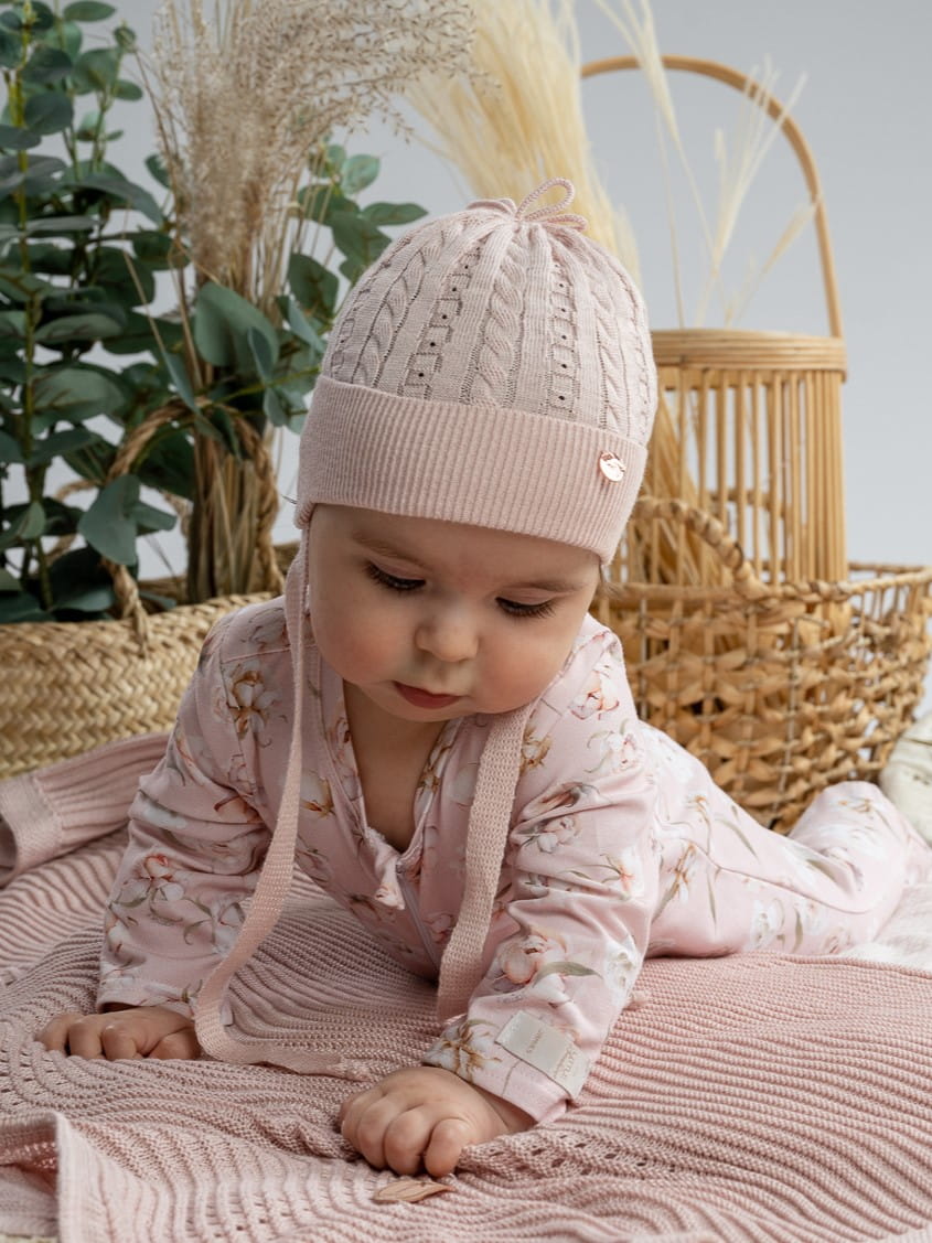 Czapka wyposażona jest w wiązanie pod szyją, co nie tylko dodaje uroku, ale także zapewnia pewne dopasowanie do głowy dziecka i zapobiega zsuwaniu się czapki. Ten praktyczny element sprawia, że czapka jest wygodna i stabilnie osadzona na główce dziecka.