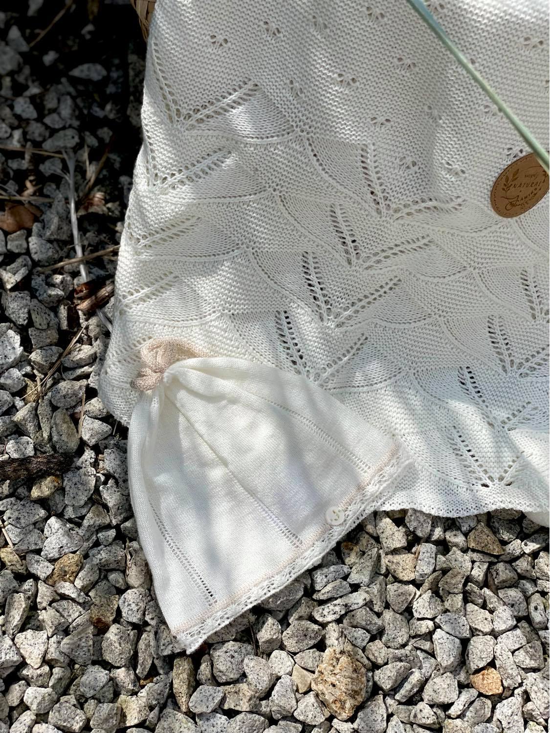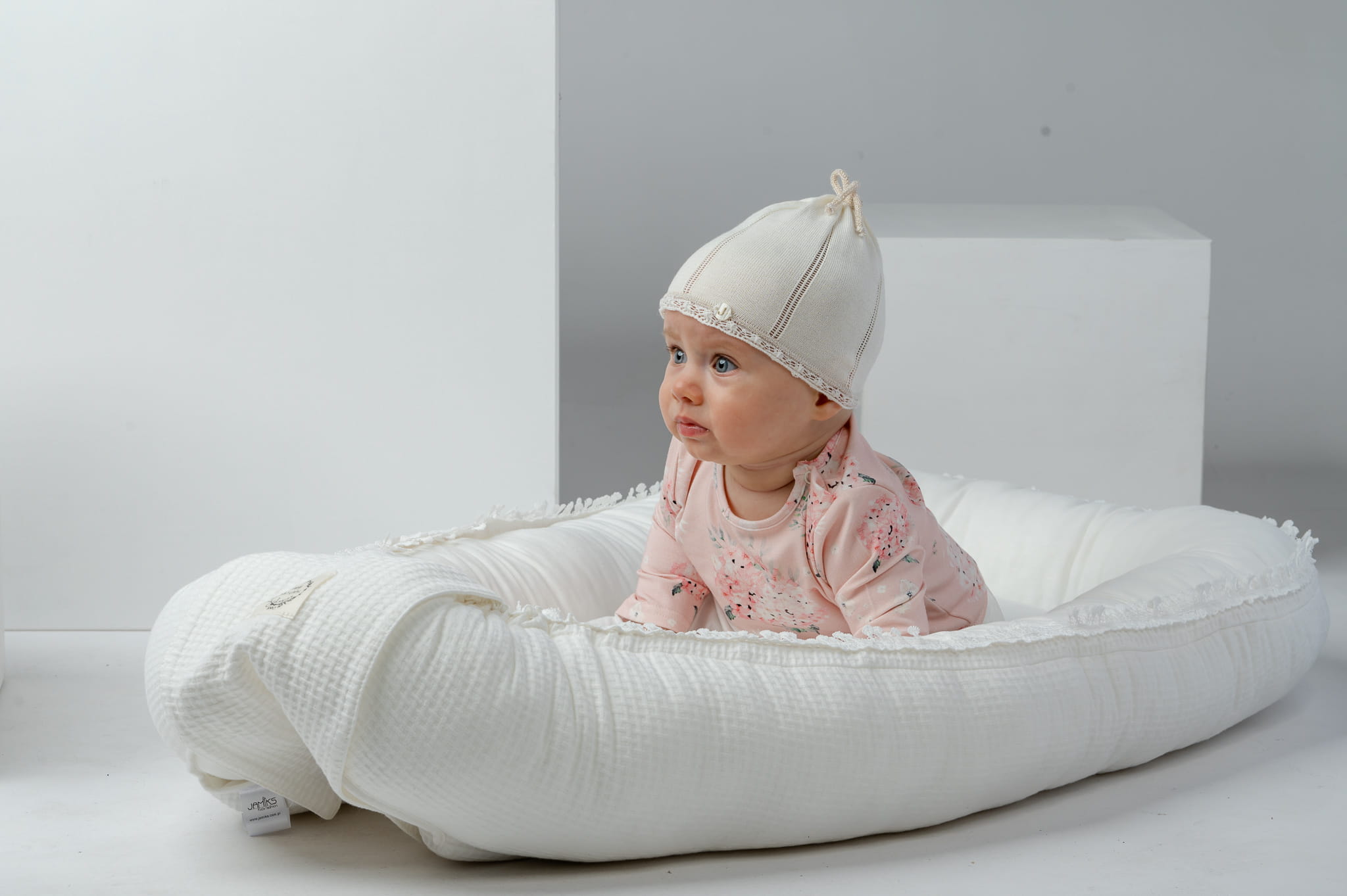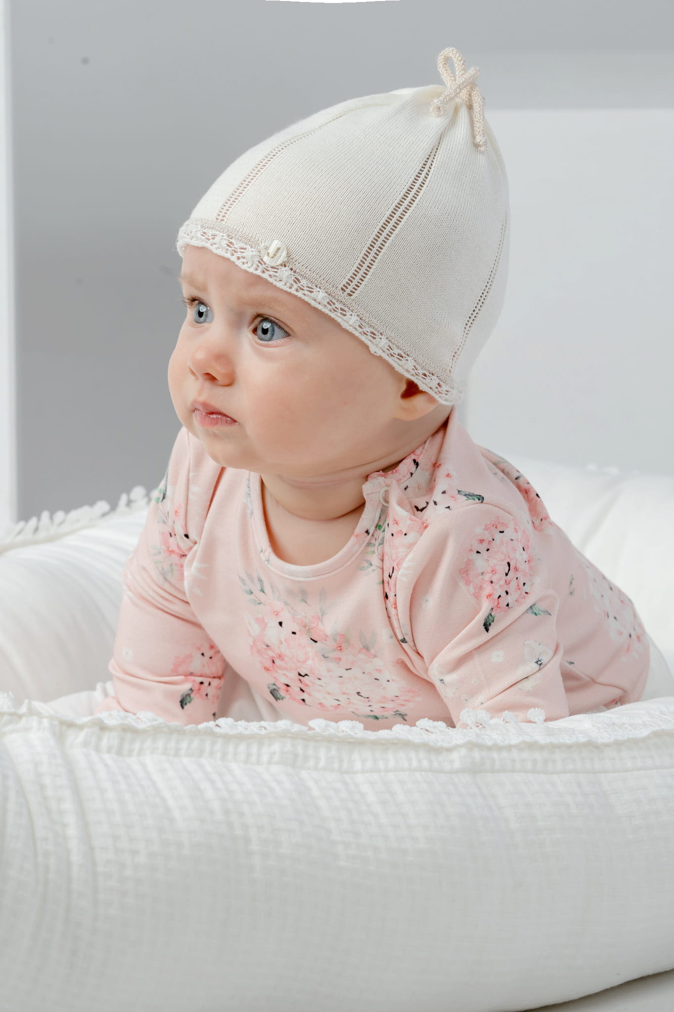 Śliczna, delikatna czapeczka zdobiona subtelną i bardzo modną w tym sezonie koronką.