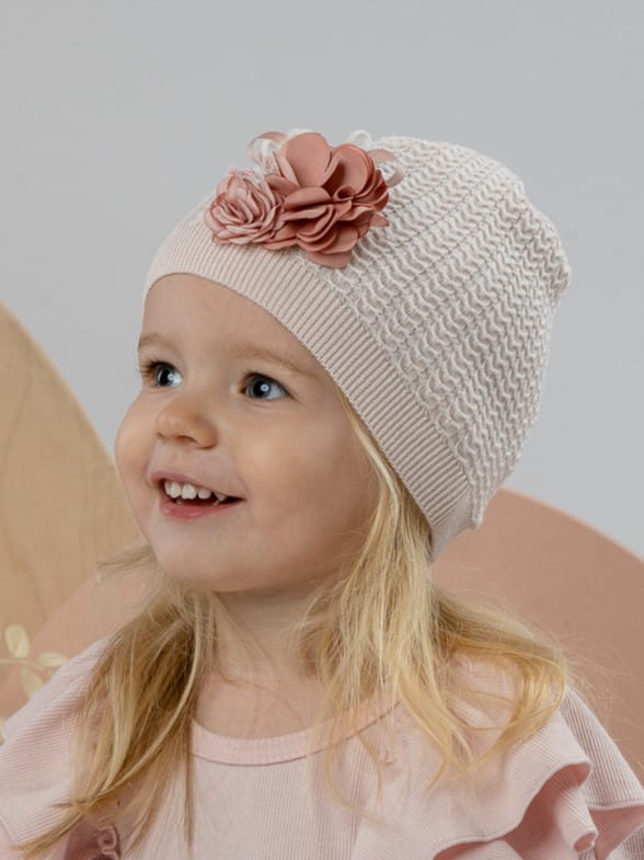Dziewczęca czapka na wiosnę MAIA z kwiatową dekoracją to uroczy i stylowy dodatek do wiosennej garderoby każdej dziewczynki. Czapka wykonana jest głównie z mieszanki materiałów: 68% wiskozy, 29% akrylu i 3% elastanu.
