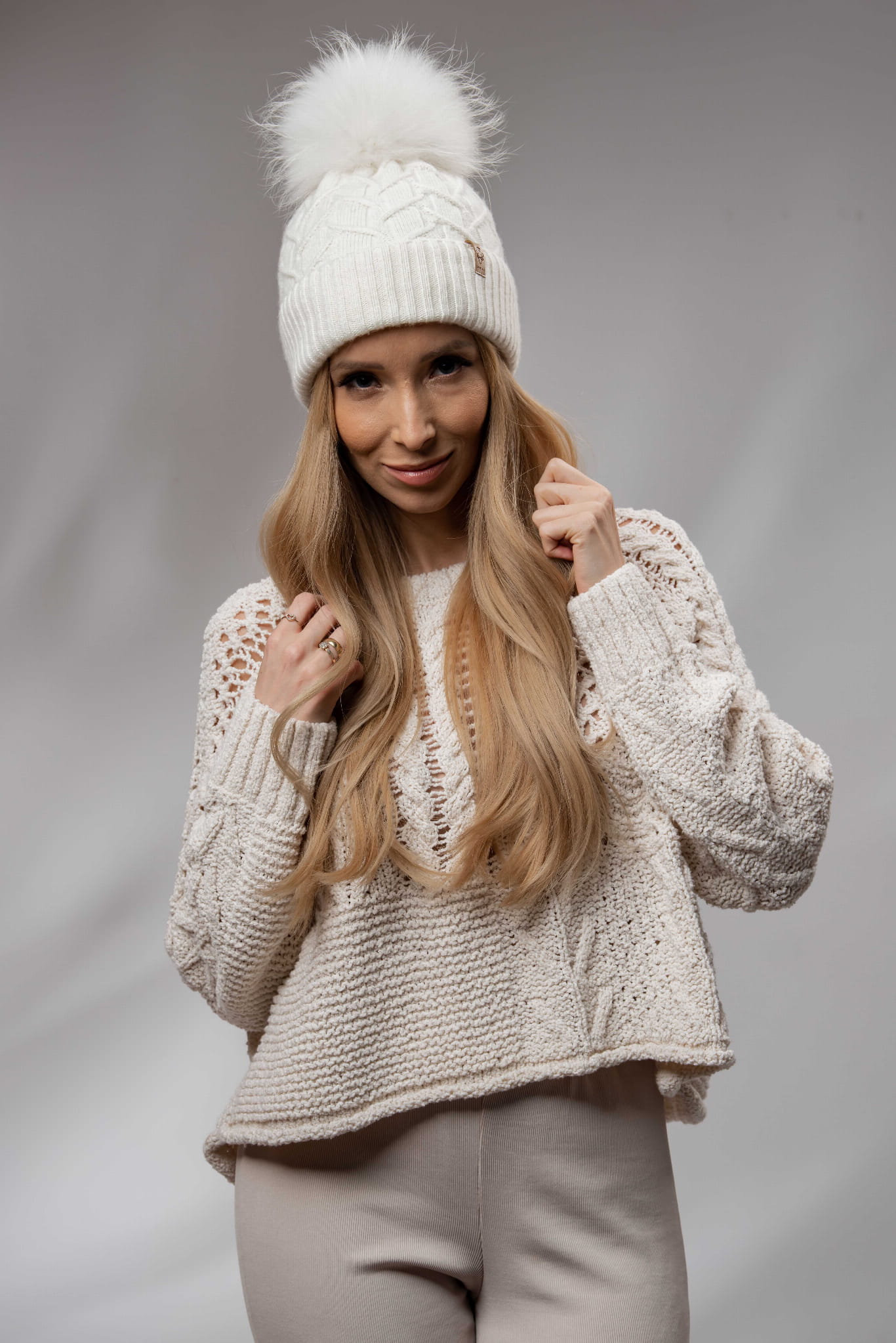 Warto zwrócić uwagę na dekoracyjny splot przędzy oraz delikatną naszywkę. Zdobienie czapki dopełnia pełny naturalny pompon.