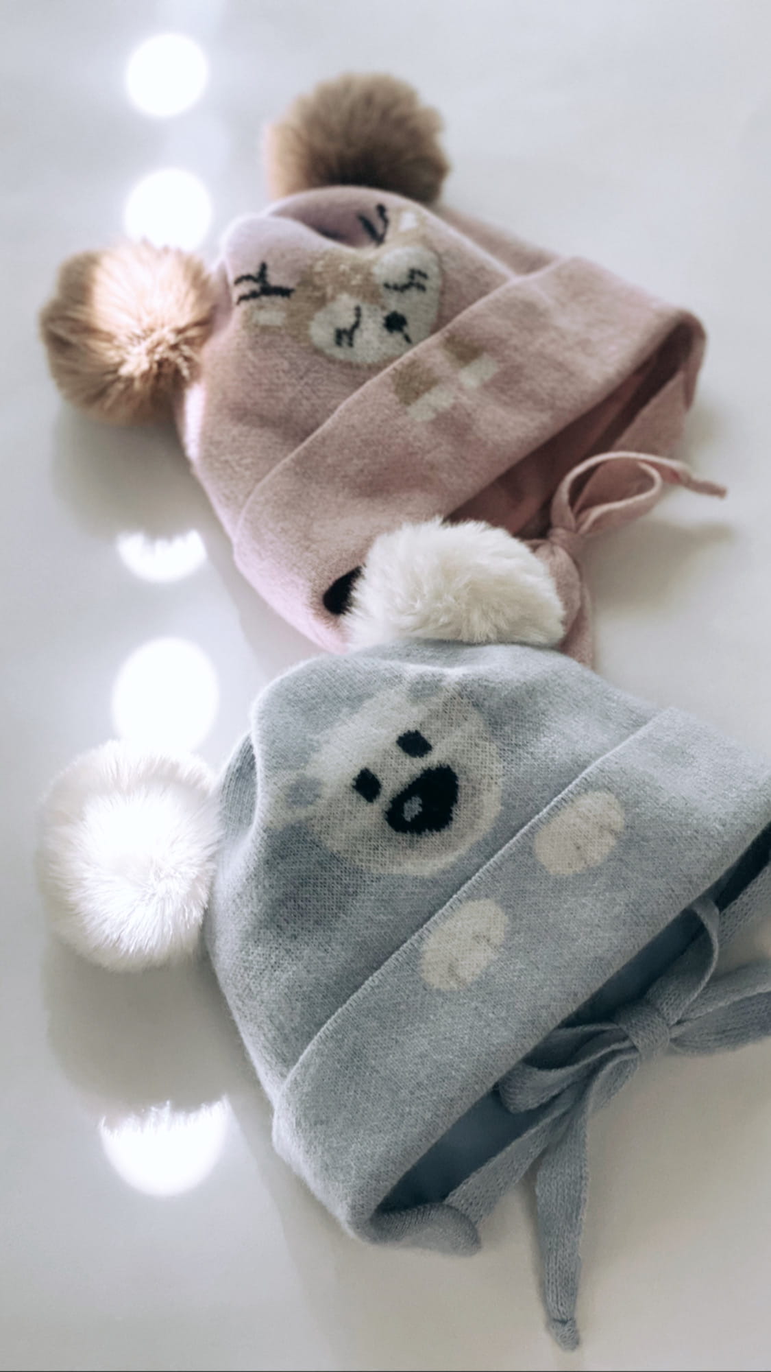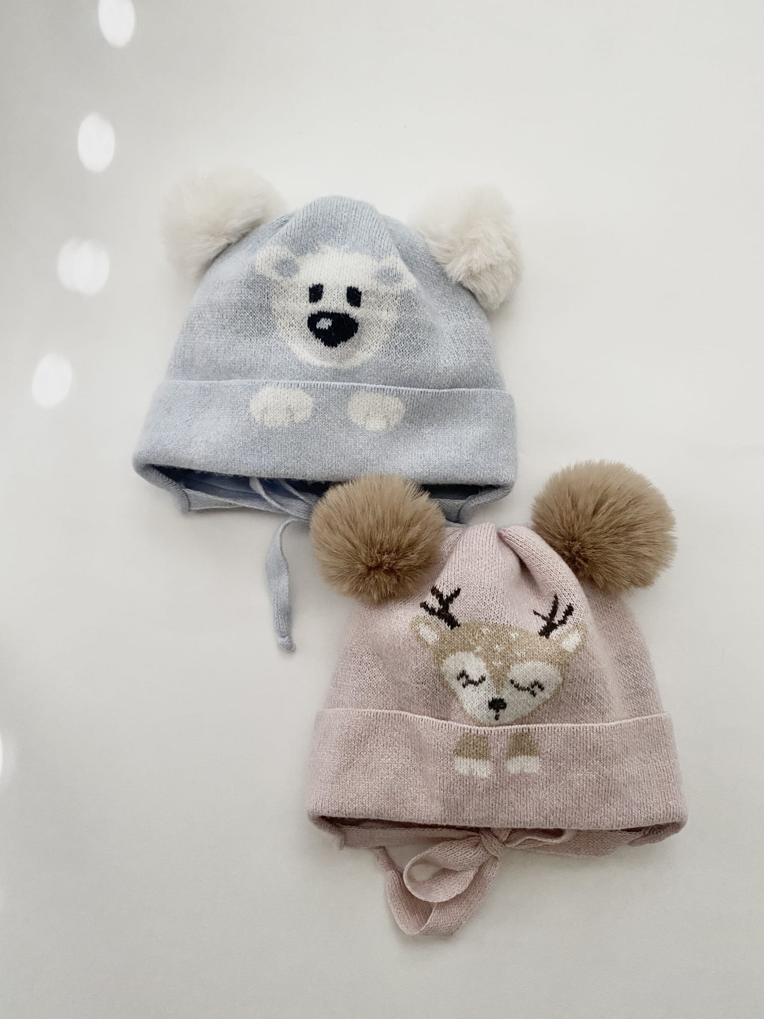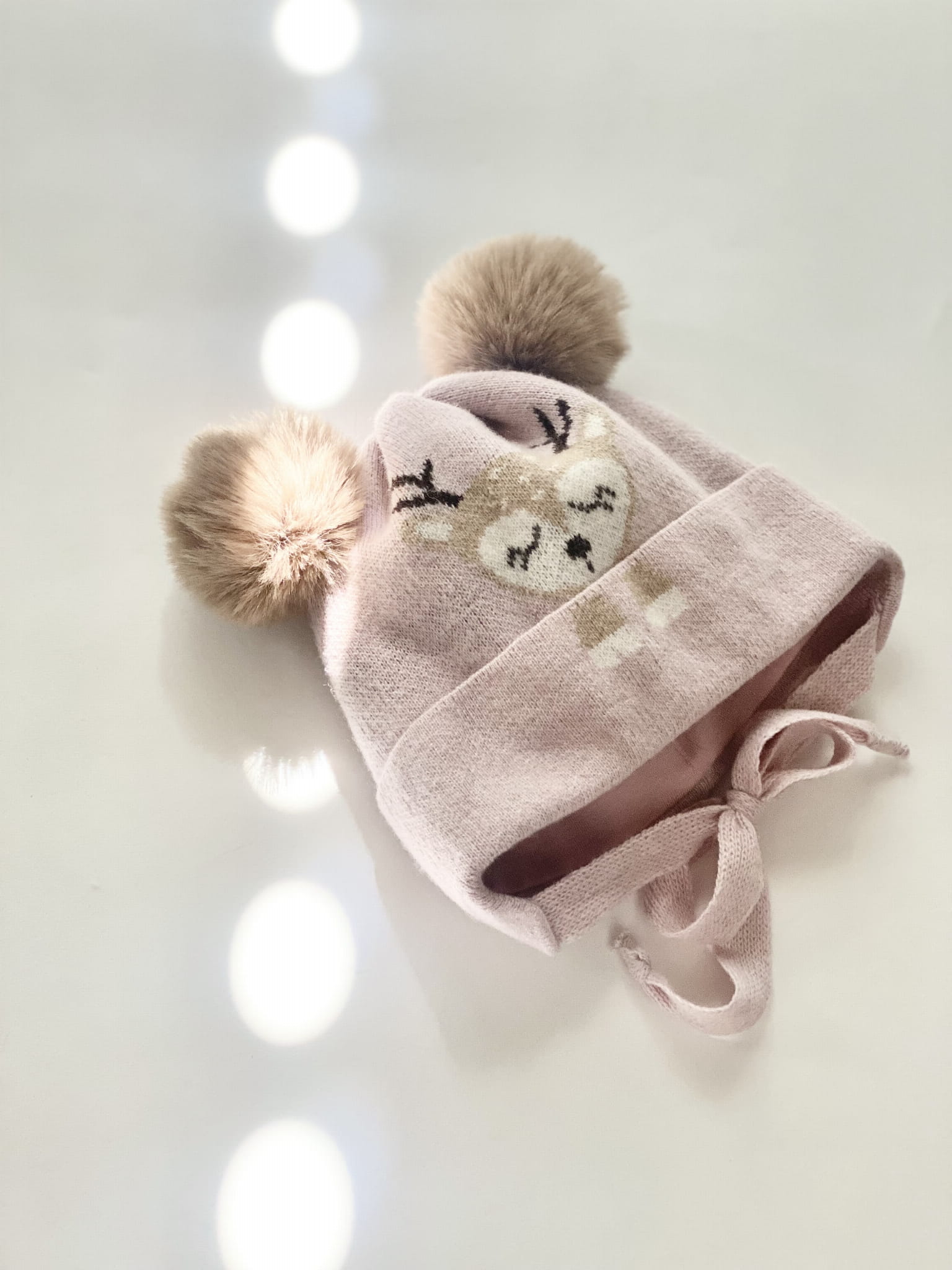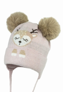 Ciepła czapka dla dziewczynki z pięknym żakardowym wzorem przedstawiającym sarenkę oraz dwoma pomponami ze sztucznego futerka.