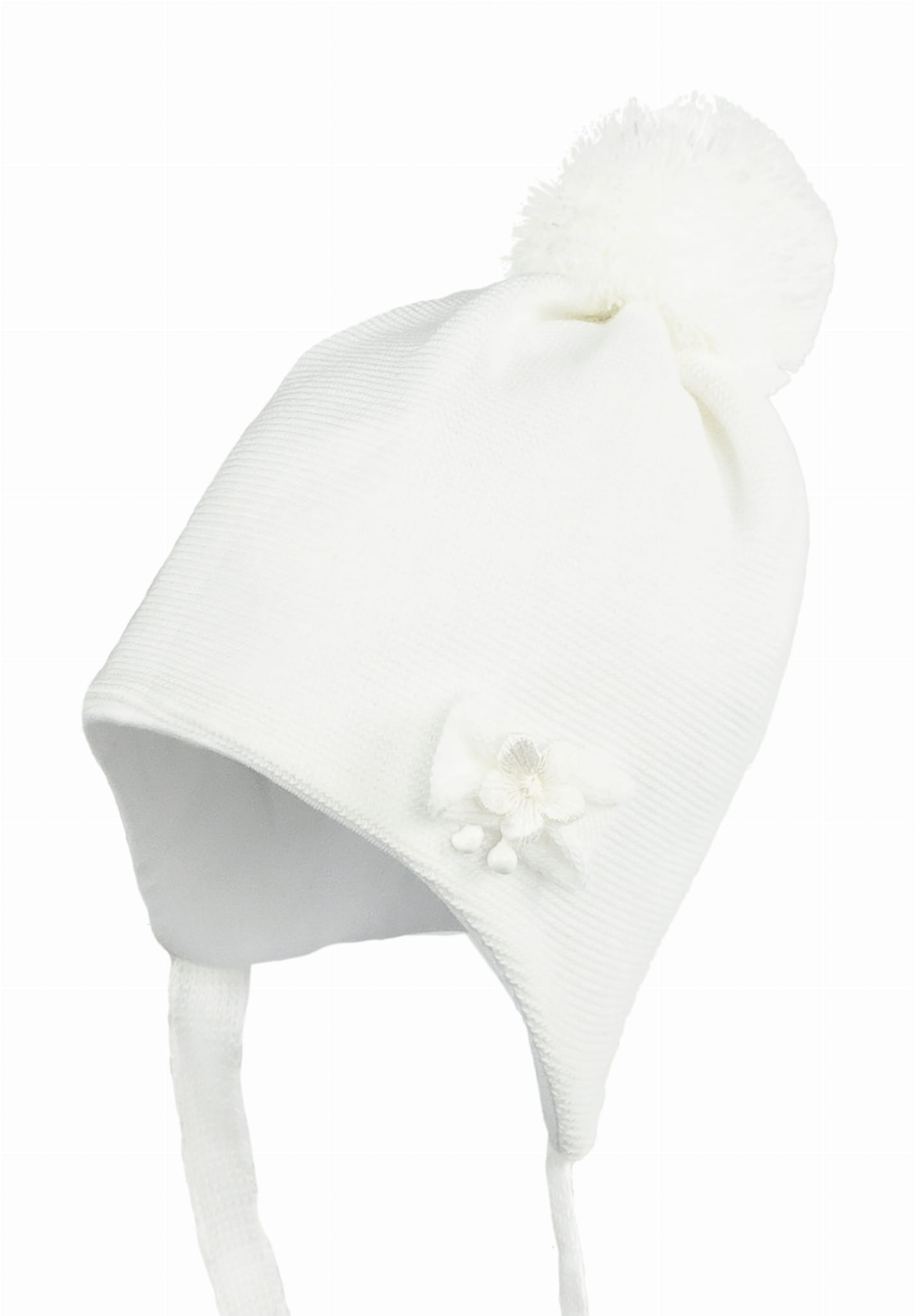 Gładka czapka zdobiona delikatną kokardką i kwiatkiem.