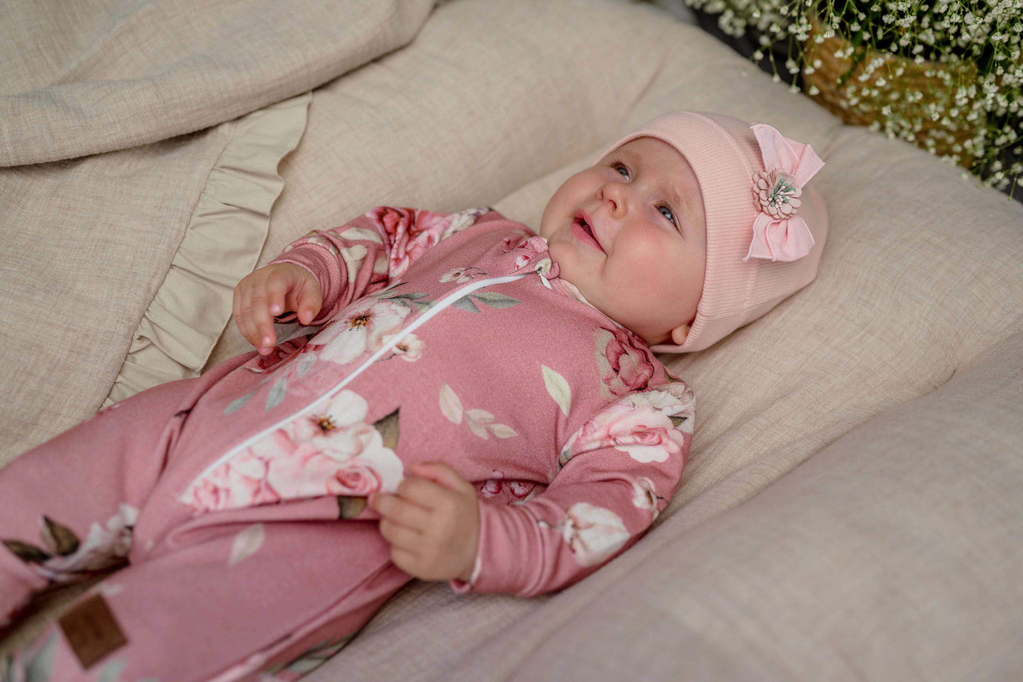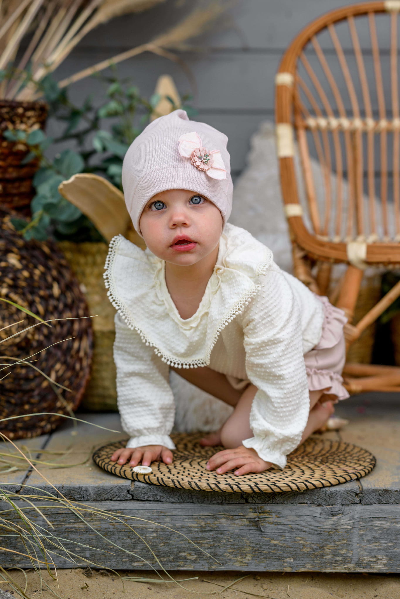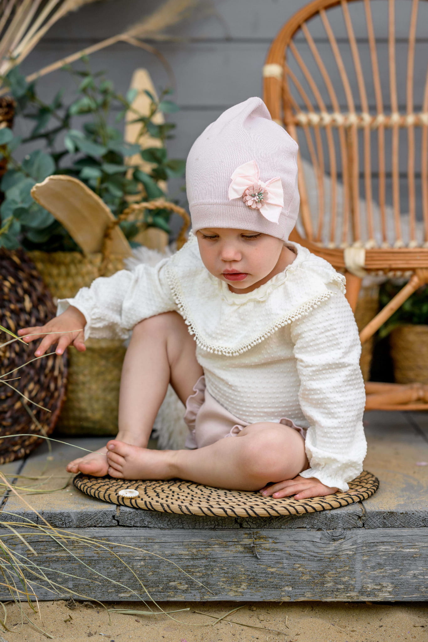 Czapeczka ozdobiona kokardką z tkaniny i kwiatkiem.