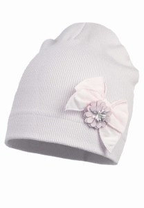 Czapeczka ozdobiona kokardką z tkaniny i kwiatkiem.