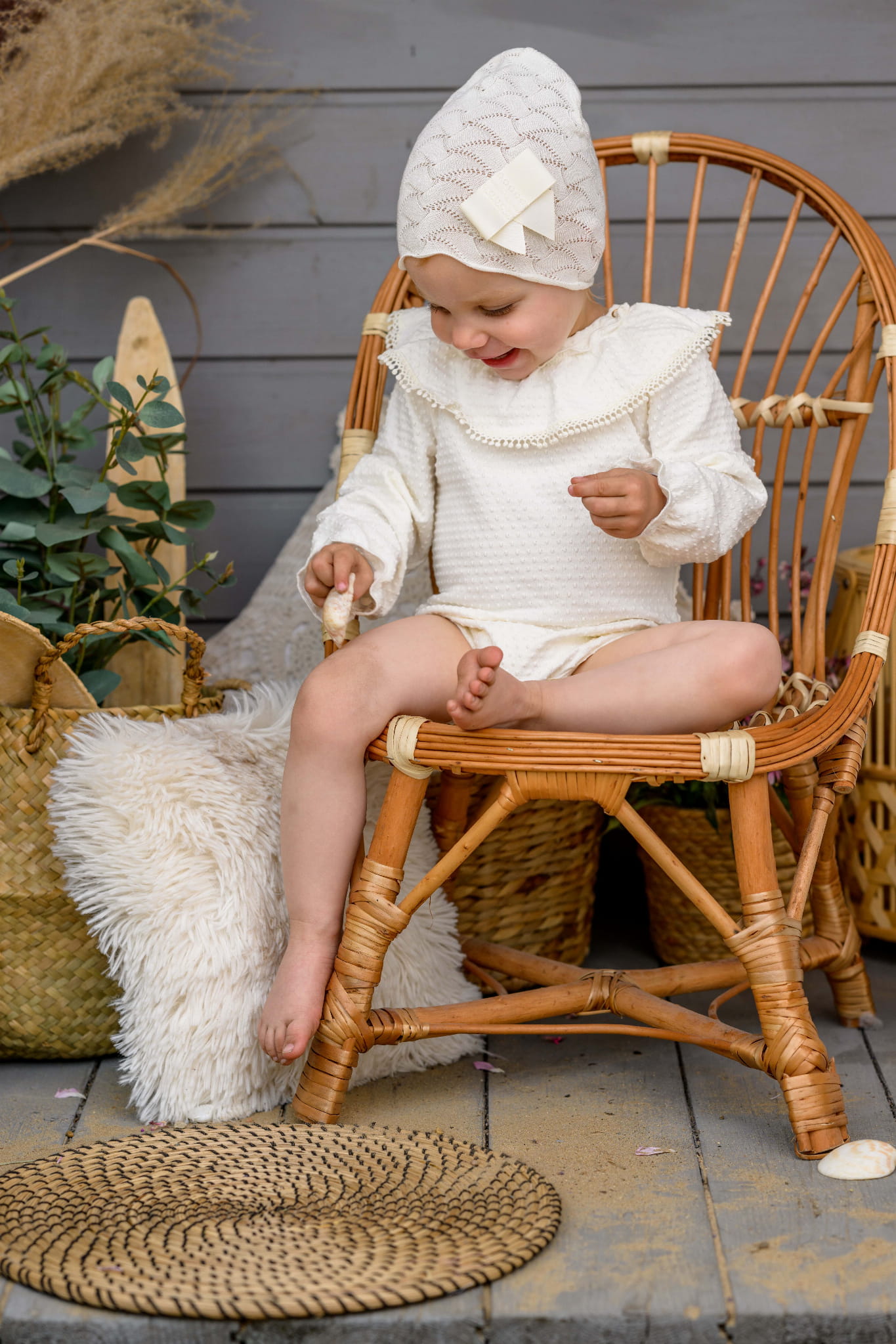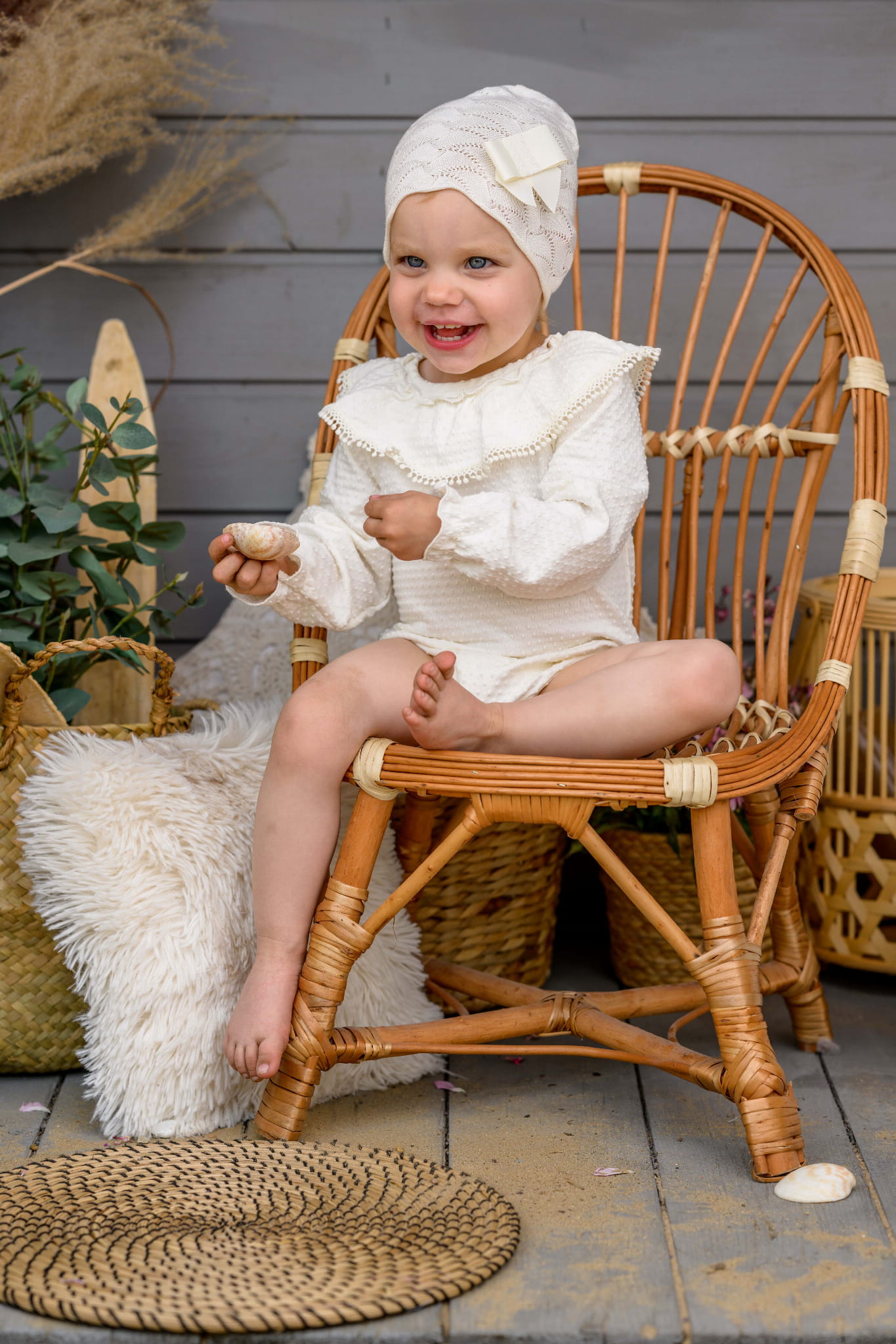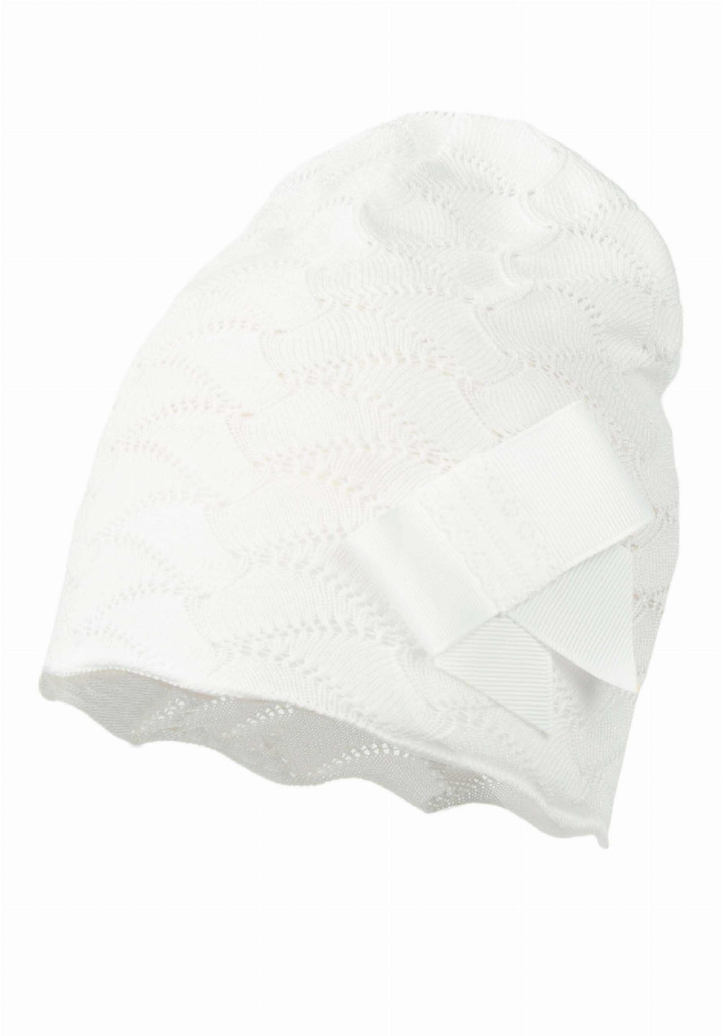 Subtelny ażurowy wzór oraz urocza kokardka sprawiają, że czapeczka wygląda wyjątkowo delikatnie i dziewczęco.
