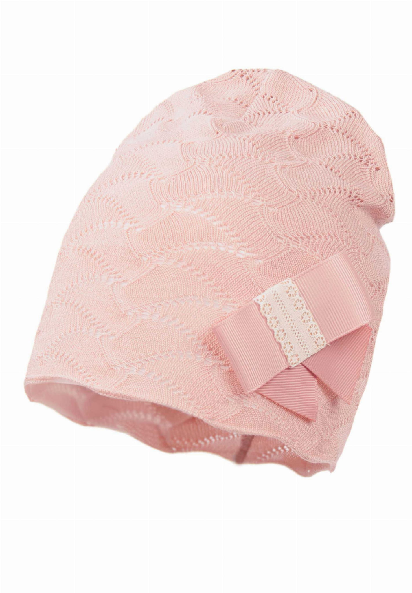 Subtelny ażurowy wzór oraz urocza kokardka sprawiają, że czapeczka wygląda wyjątkowo delikatnie i dziewczęco.
