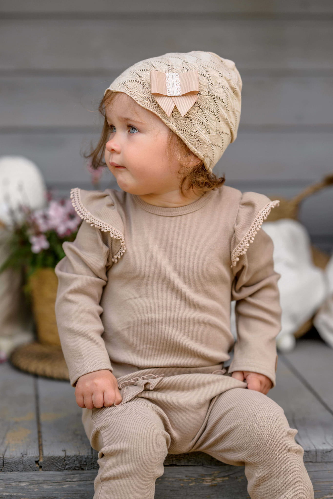 Subtelny ażurowy wzór oraz urocza kokardka sprawiają, że czapeczka wygląda wyjątkowo delikatnie i dziewczęco.
