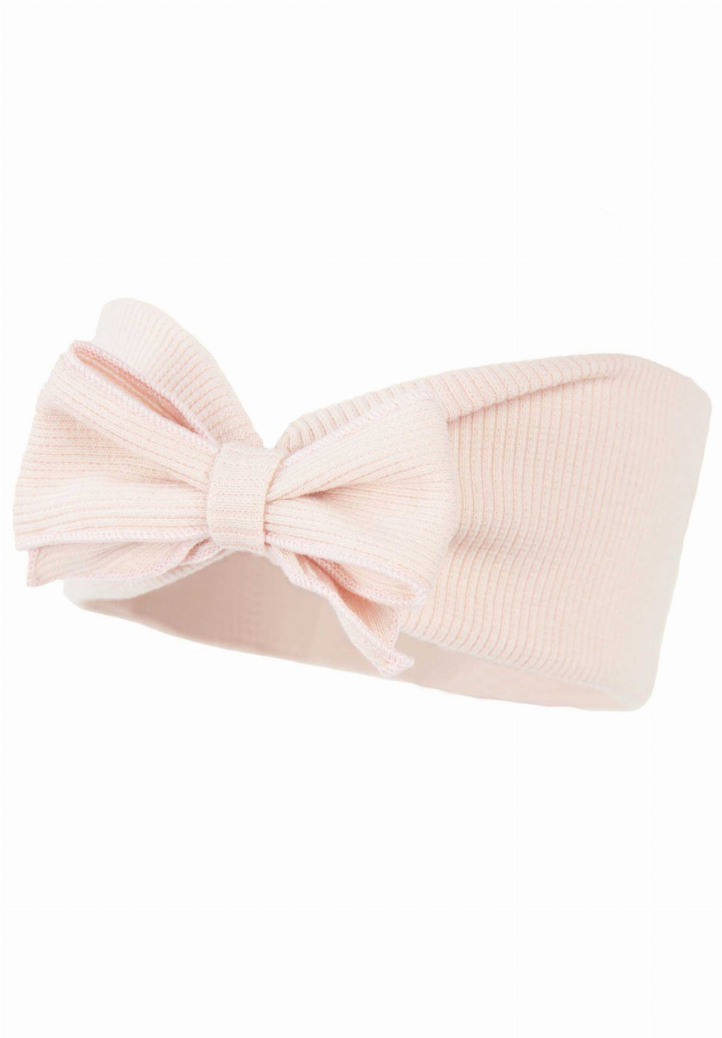 Dziewczęca opaska na uszy z ozdobna kokardą, uszyta z dzianiny typu "prążek".