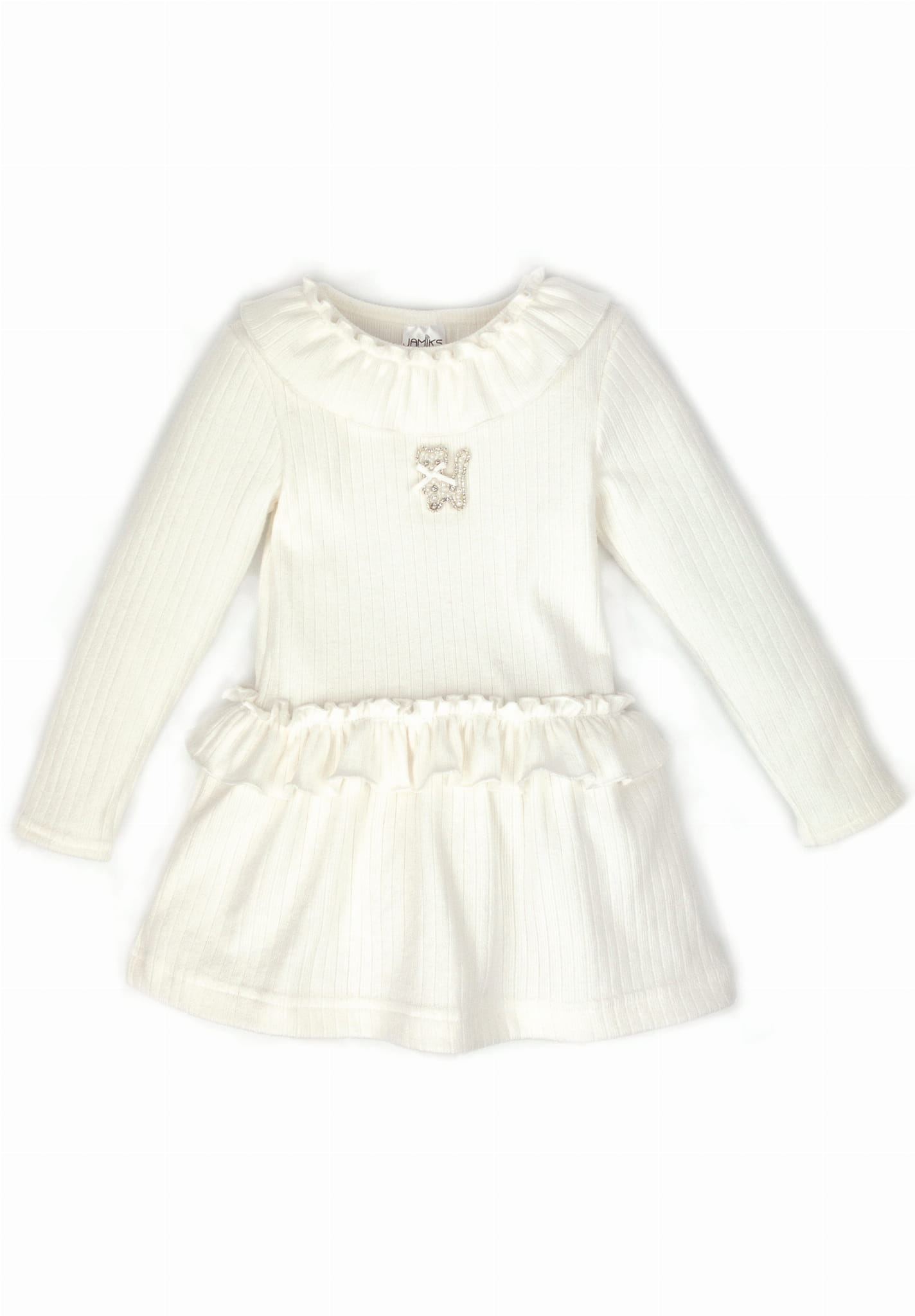 AELITA to propozycja wygodnej sukienki z długim rękawem dla dziewczynki. Falbanka na wysokości pasa oraz przy kołnierzu dodaje uroku kreacji. Do tego słodki akcent w postaci ręcznie wykonanej ozdoby z perełek i błyszczących kamieni w kształcie kotka na pewno przypadnie do gustu niejednej damie.