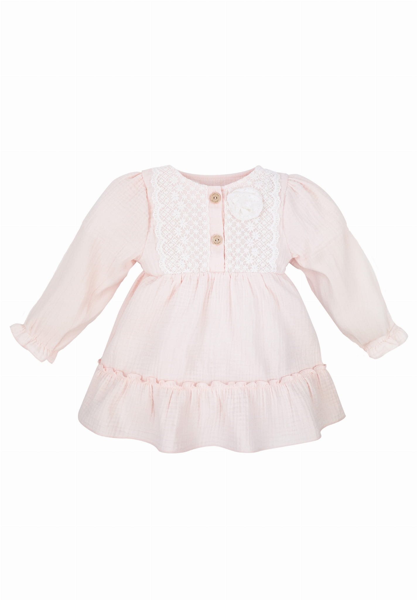 Dziewczęca sukienka GRENADA wykonana została organicznej bawełny w pięknym odcieniu jasnej moreli. Koronkowe zdobienia dodają sukience subtelności i dziewczęcego uroku, podkreślając delikatność sukienki.