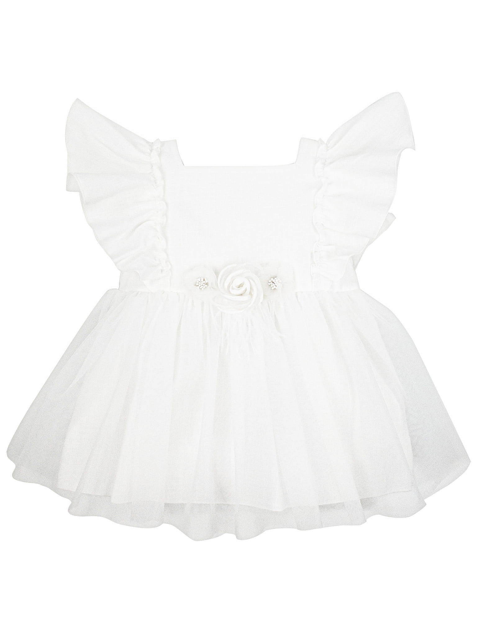 Dziewczęca sukienka JUDITH II to urocza i dziewczęca kreacja, która zachwyci każdą małą fashionistkę. Sukienka wykonana jest z delikatnego materiału, który pięknie podkreśla dziewczęcy urok. Krótkie, ozdobne rękawy dodają sukience lekkości i delikatności, a tiulowe aplikacje sprawiają, że całość nabiera wyjątkowego, bajkowego charakteru.