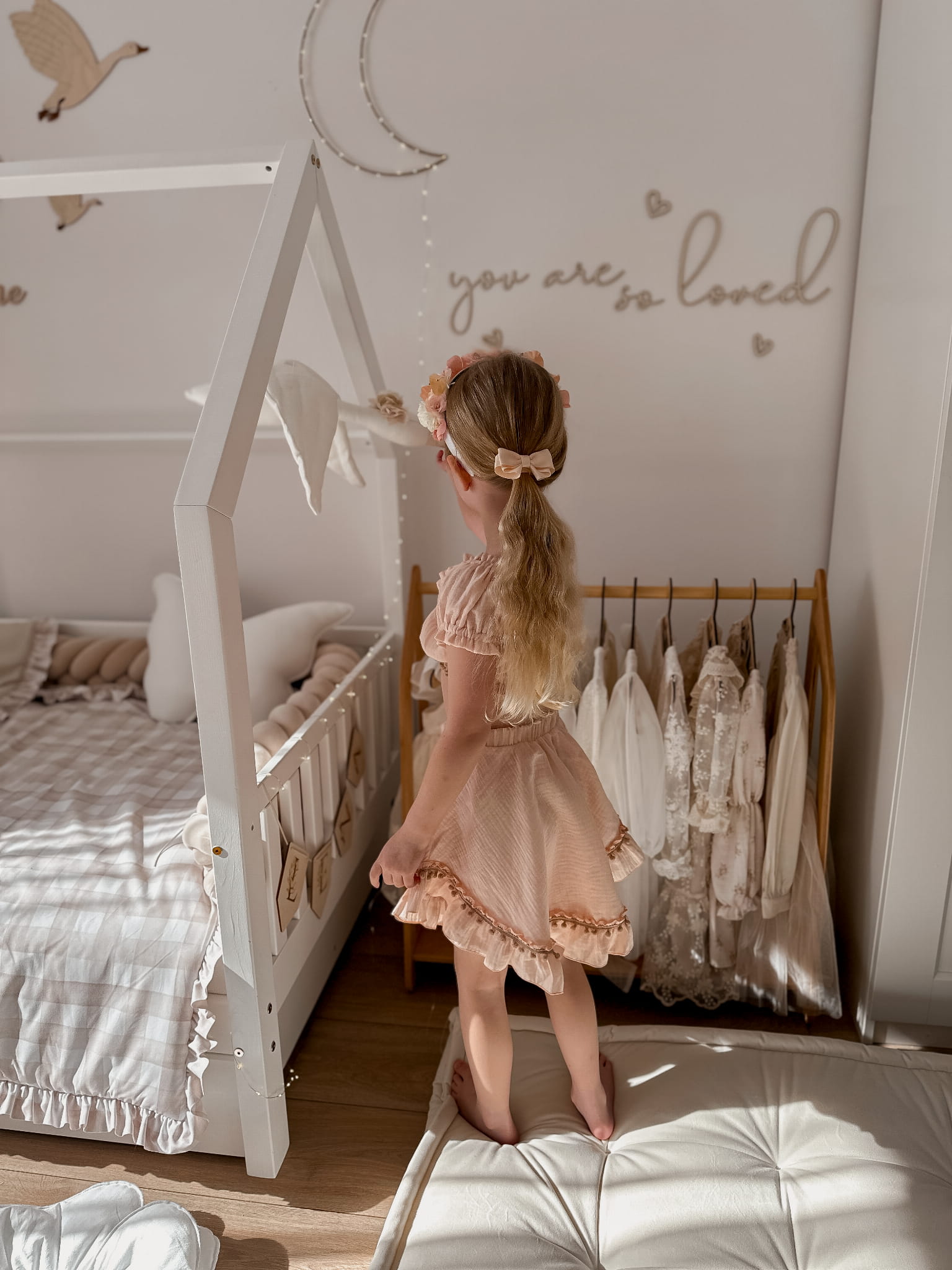 Komplet OPHELIE to zjawiskowy zestaw na ciepłe dni. Został wykonany z organicznej bawełnianej tkaniny, która gwarantuje komfort i swobodę ruchu w letnie dni, pozwalając Twojej małej księżniczce cieszyć się każdą chwilą.