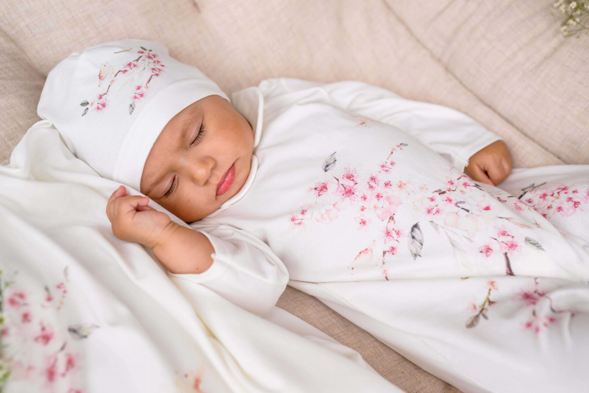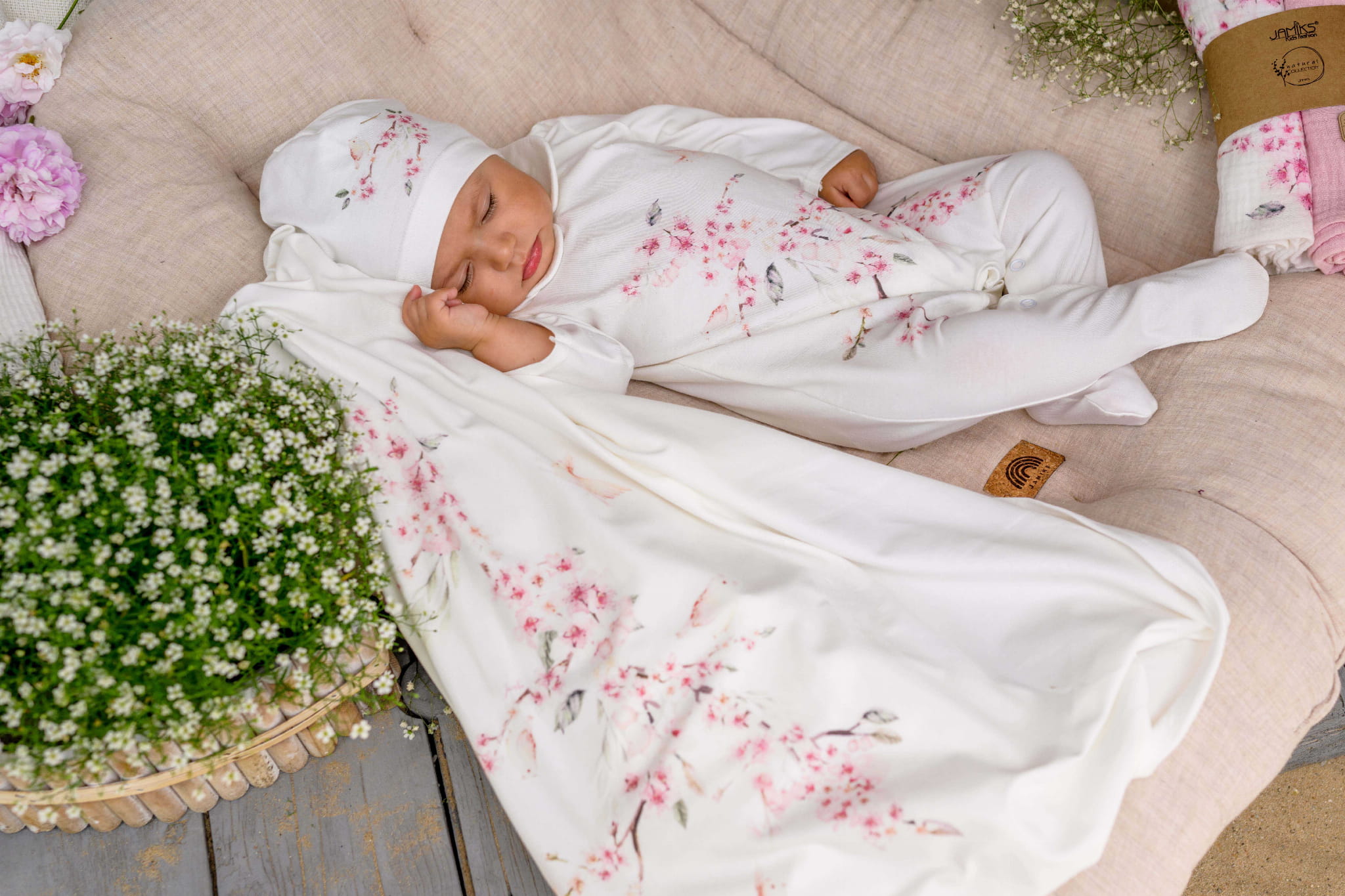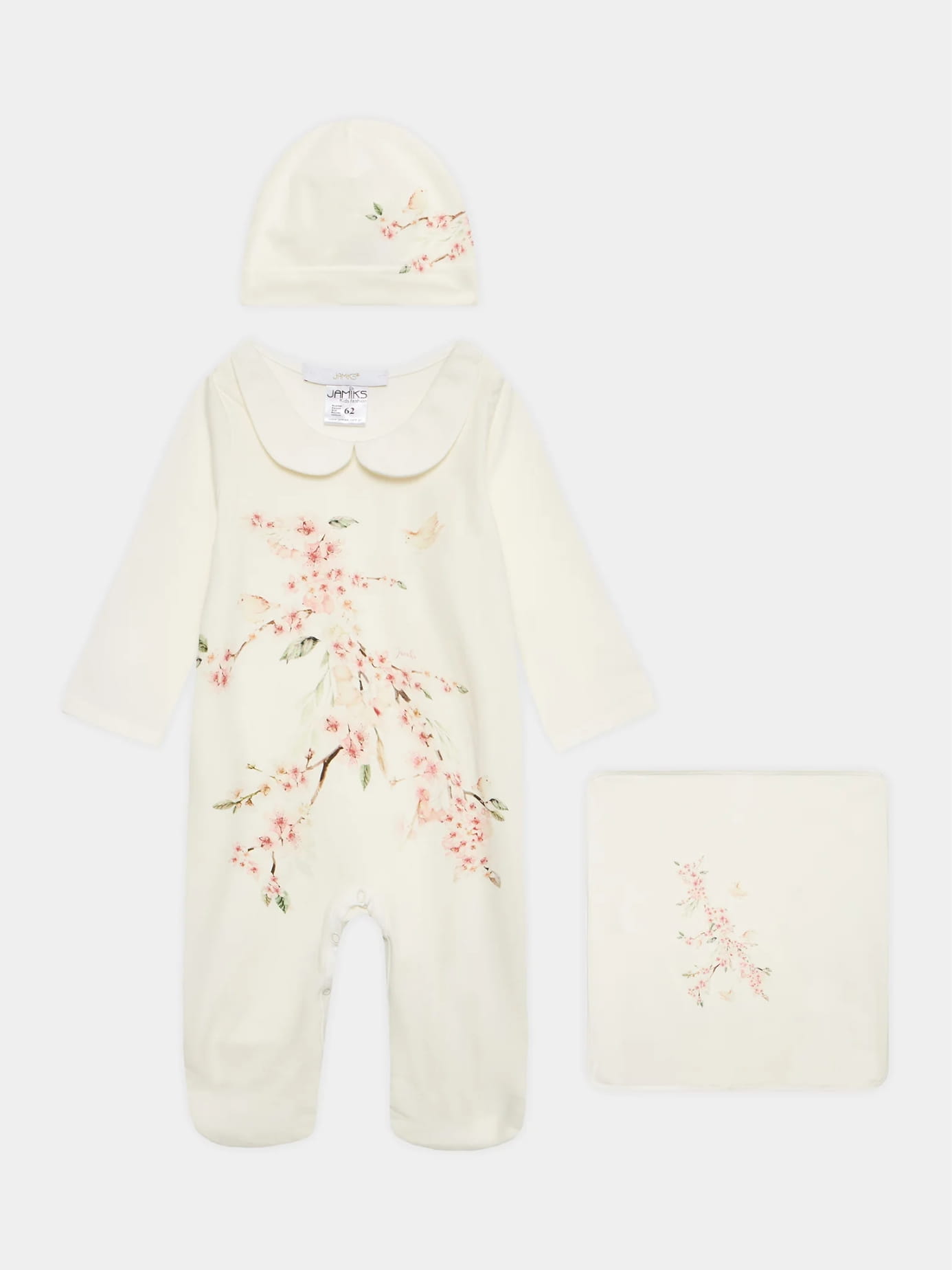 W skład zestawu wchodzi pajacyk z długim rękawkiem, otulacz, czapka oraz pudełko prezentowe.