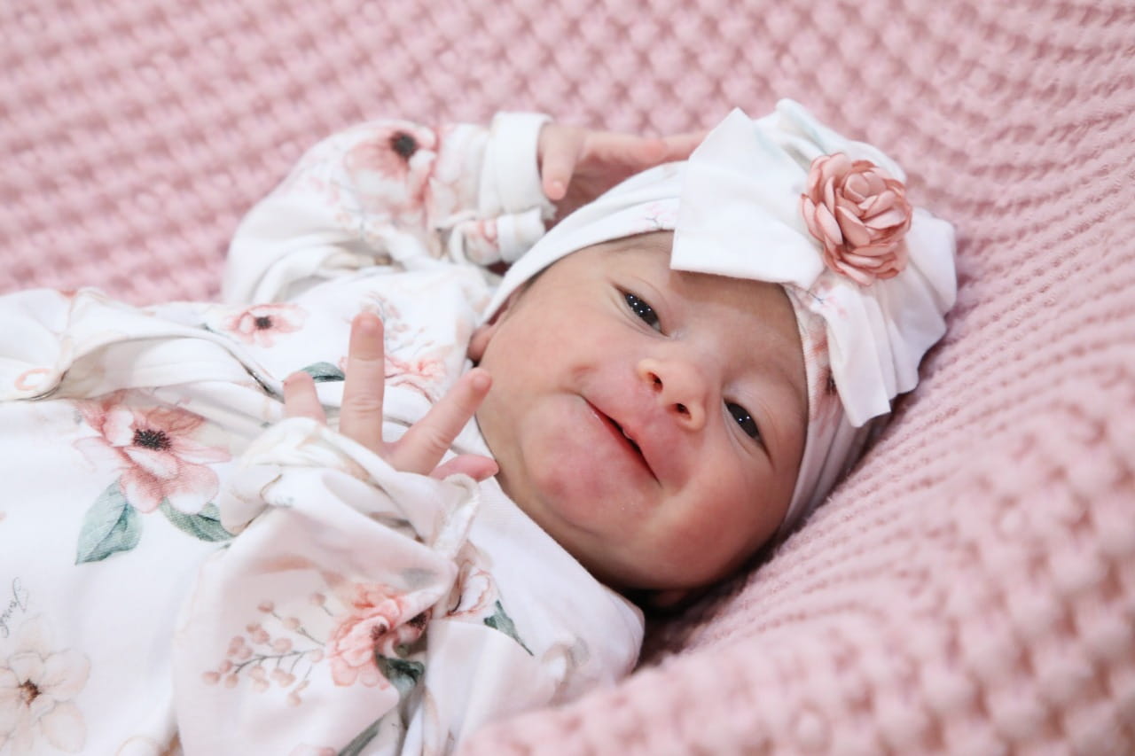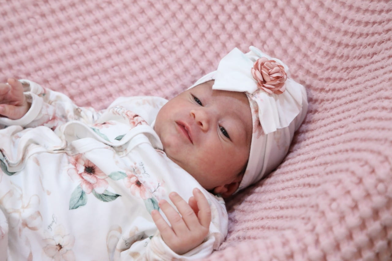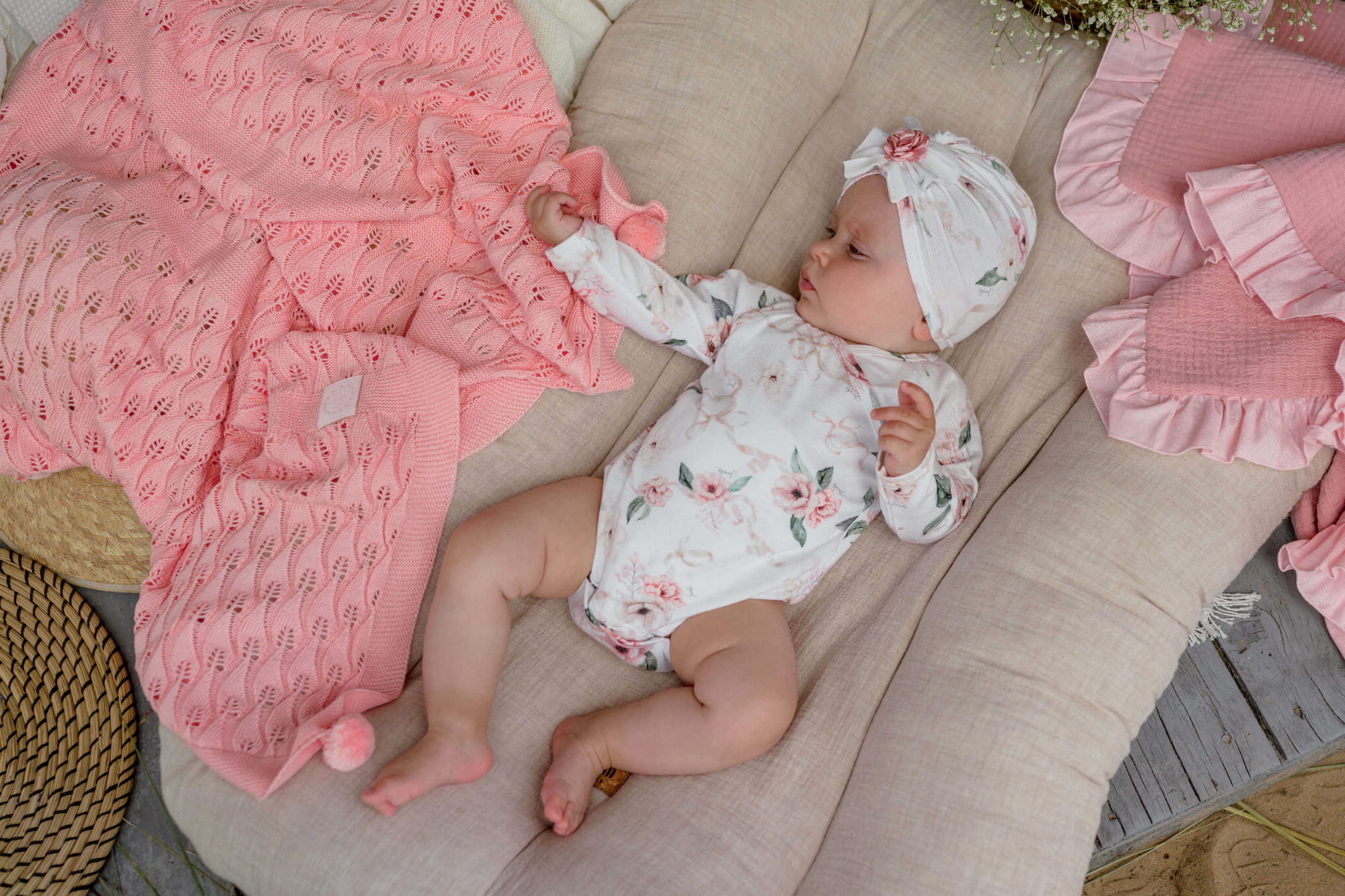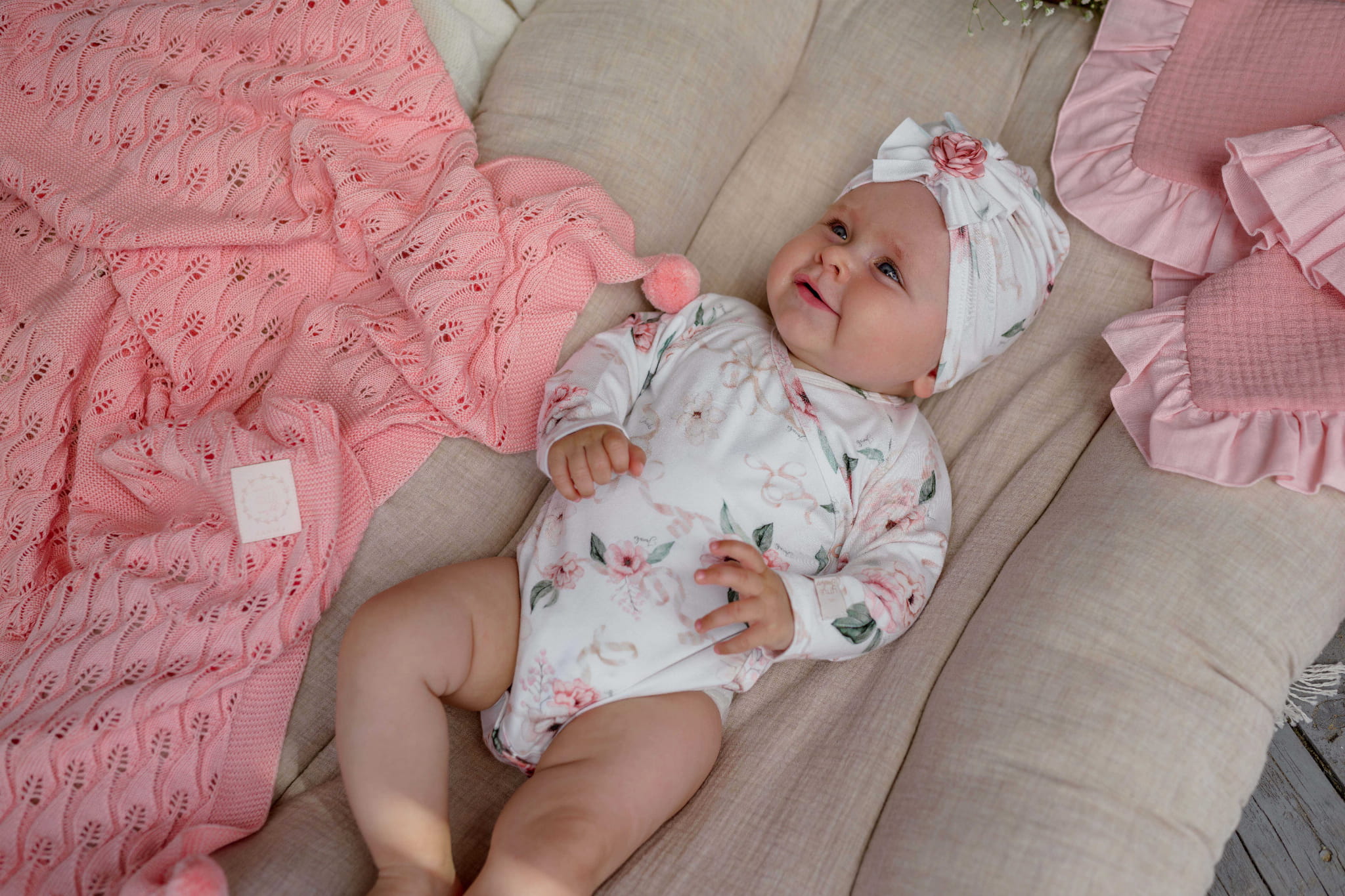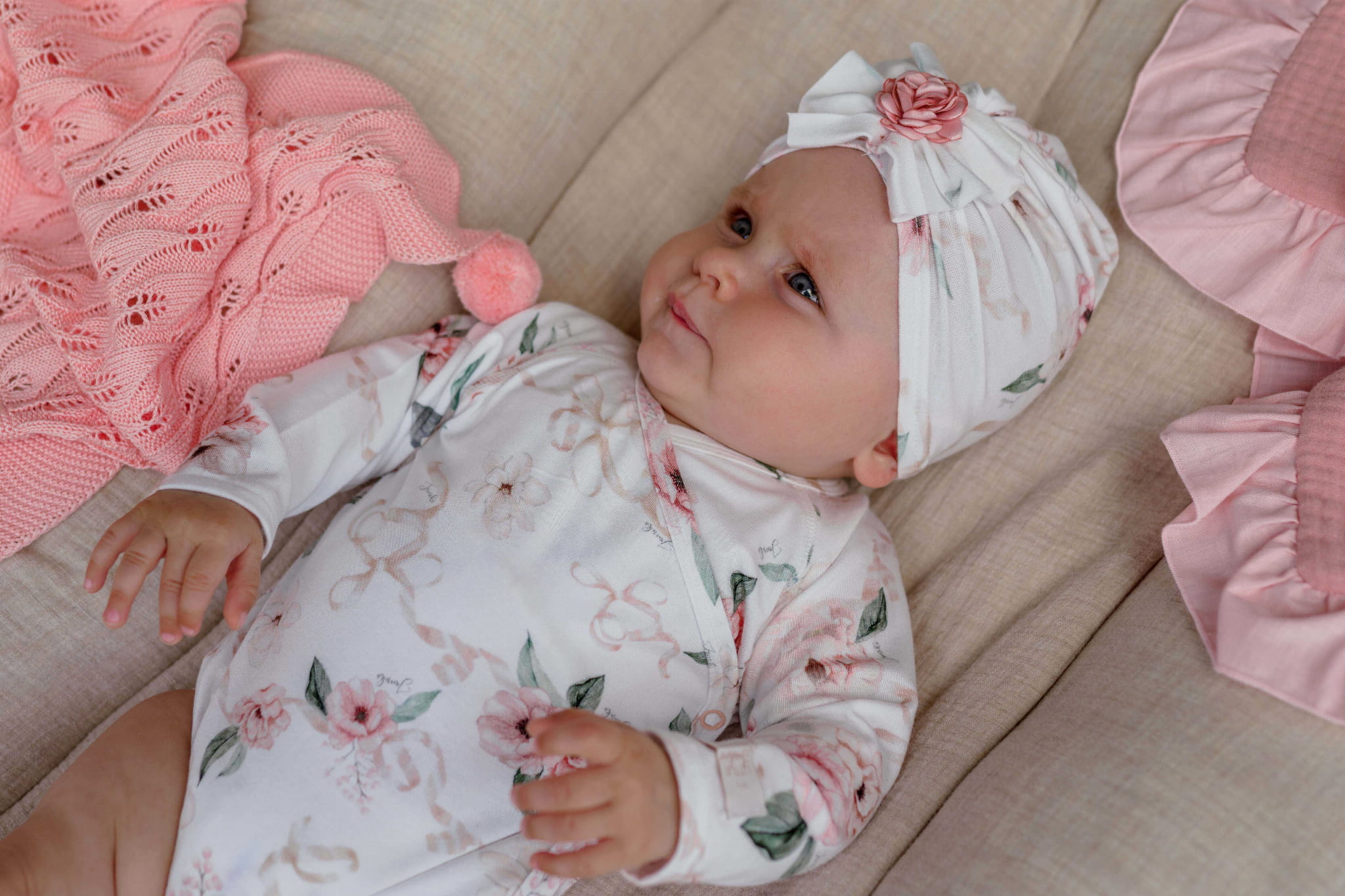 Przód czapeczki zdobi urzekająca kokarda z kwiatuszkami.