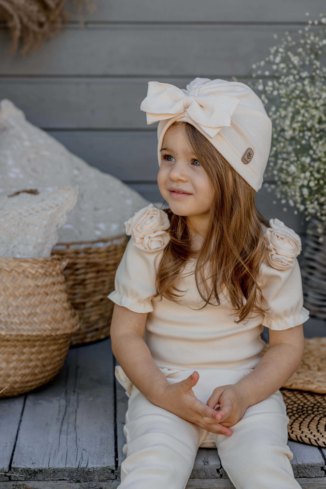 Przód czapeczki zdobi urzekająca kokarda.