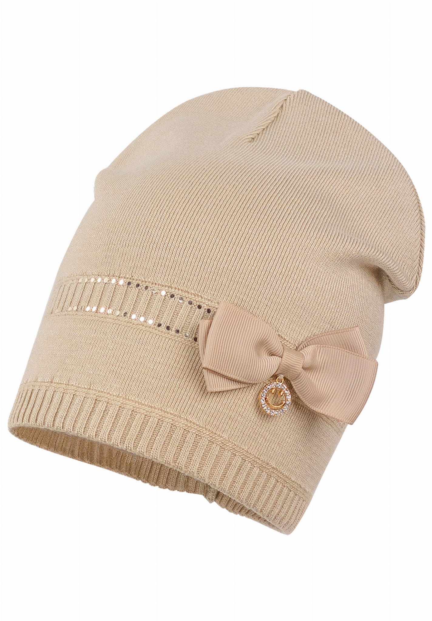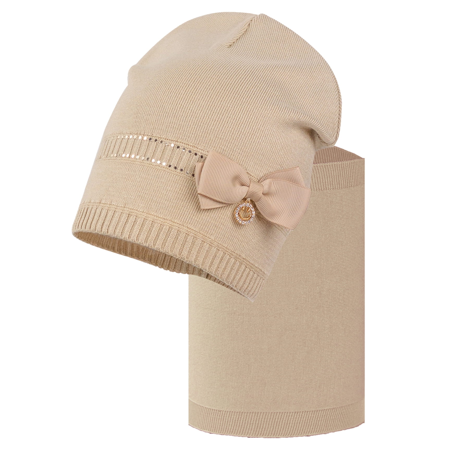 Dziewczęca czapka na wiosnę BARBUDA typu beanie wraz z kominem HELI. Czapka ozdobiona kokardką, to uroczy i stylowy dodatek do wiosennej garderoby każdej dziewczynki. Komplet wykonany został z mieszanki materiałów: 68% wiskozy, 29% akrylu i 3% elastanu.