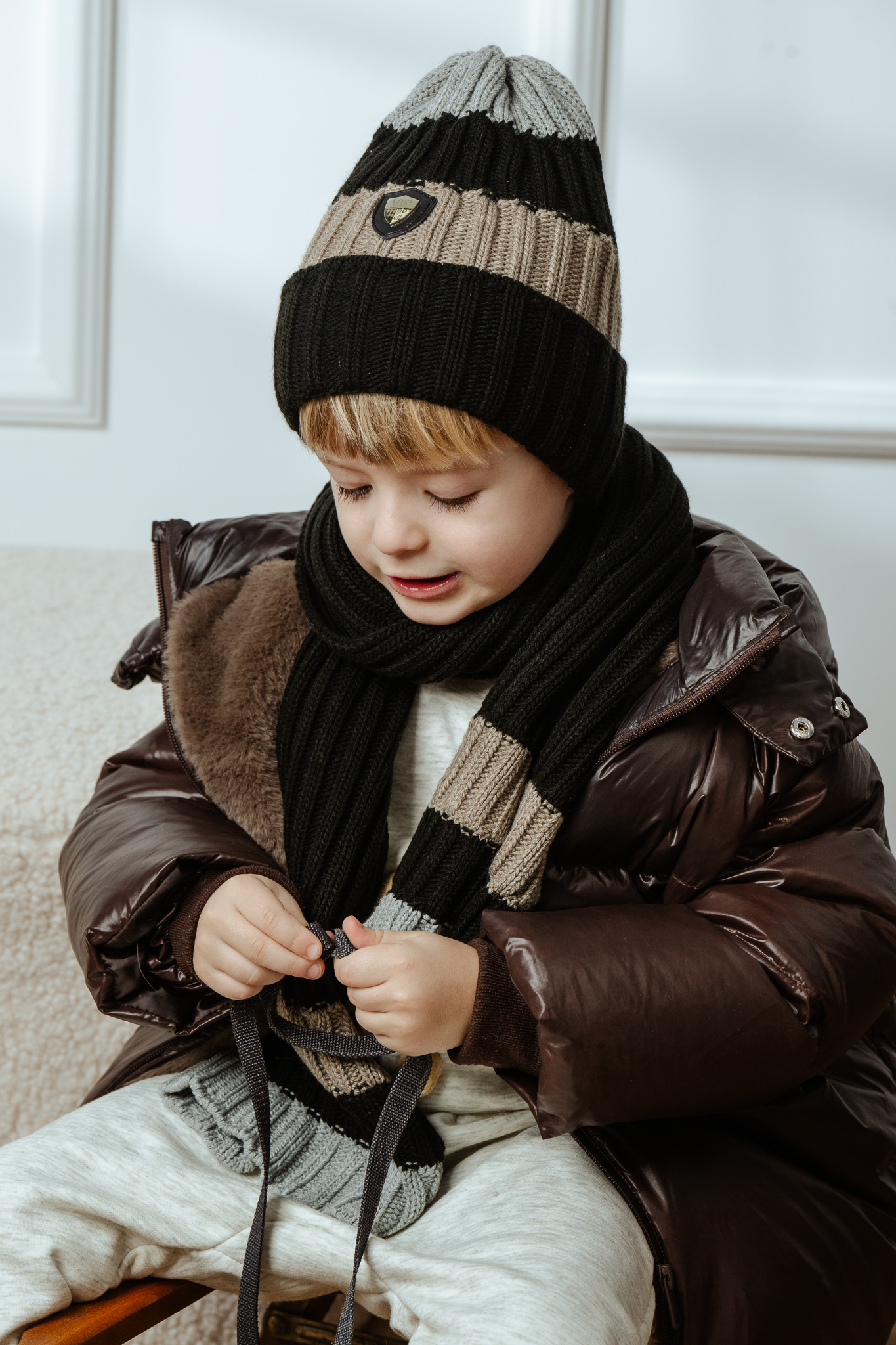 Komplet chłopięcy RUFUS – czapka z naszywką i pasujący do niej szal- idealny zestaw na chłodne zimowe dni.