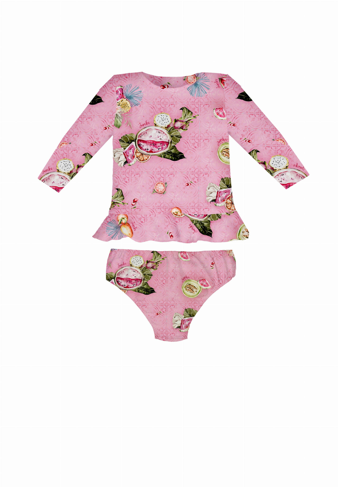 Funkcjonalny, wygodny i zdobiony pięknym printem strój kąpielowy dla dziewczynki.