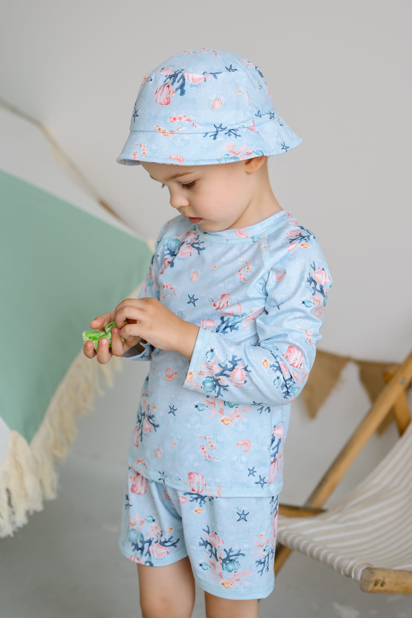 Tkanina skutecznie chroni delikatną skórę dziecka przed promieniowaniem słonecznym, nawet podczas długich godzin spędzonych na plaży czy przy basenie.