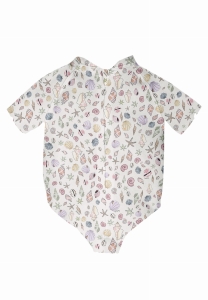 Funkcjonalny, wygodny i zdobiony pięknym printem kombinezon kąpielowy dla dziewczynki.